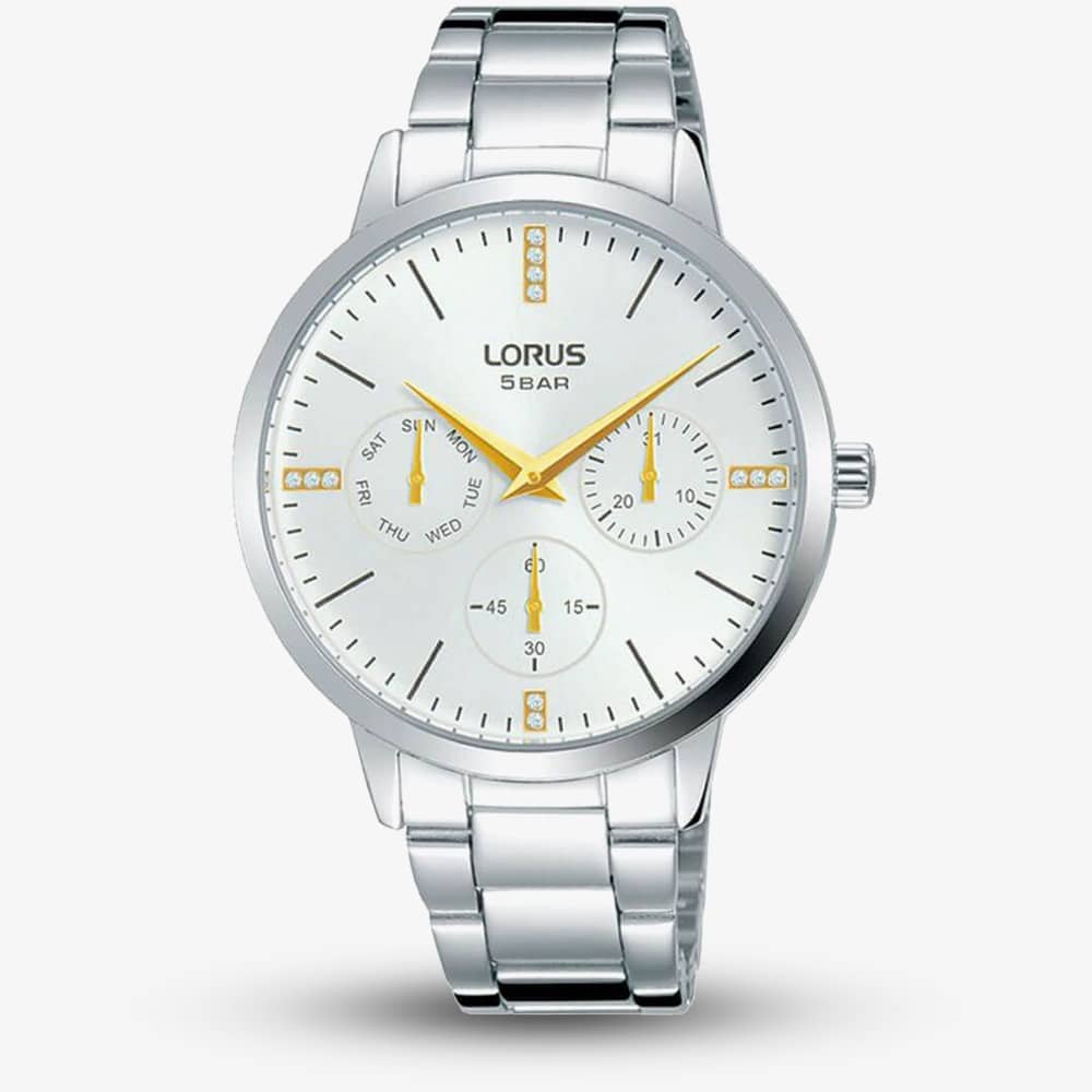The Lorus Ladies Bracelet Watch RP629DX9 combines a 36mm round shaped base metal case and a silver tone base metal bracelet with a fold over clasp. It has a white analogue dial with date subdials and sparkling accents, which is protected beneath mineral crystal glass. Power is generated by the quartz movement. This model also has a water resistance of up to 50 metres.