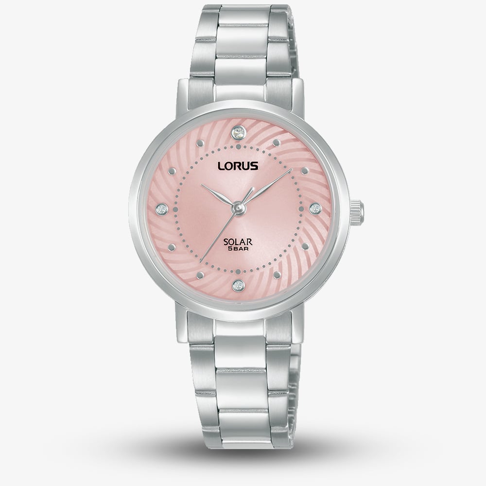 Pretty and fashionable, this Lorus watch brings a touch of elegance to everyday style. It features a polished stainless steel bracelet and case, paired with a soft light pink sunray dial that adds a subtle pop of colour. Sparkling stone-set hour markers enhance the dial with a hint of glamour, making this timepiece a perfect blend of femininity and sophistication.