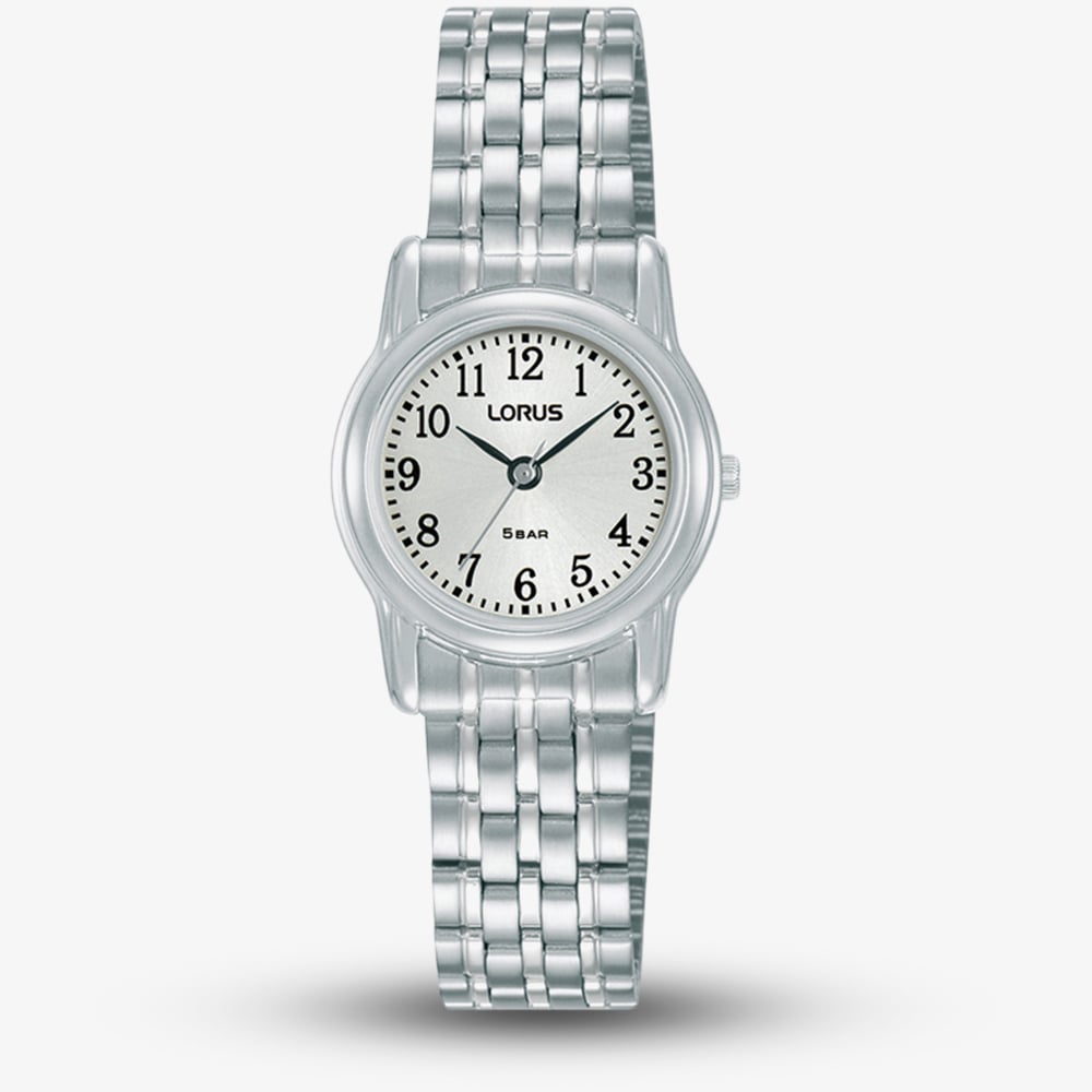 This Lorus ladies watch features a refined design crafted from silver-tone stainless steel and durable brass, exuding both elegance and resilience. The sleek silver dial is adorned with easy-to-read Arabic numeral markers, providing a classic and timeless aesthetic.