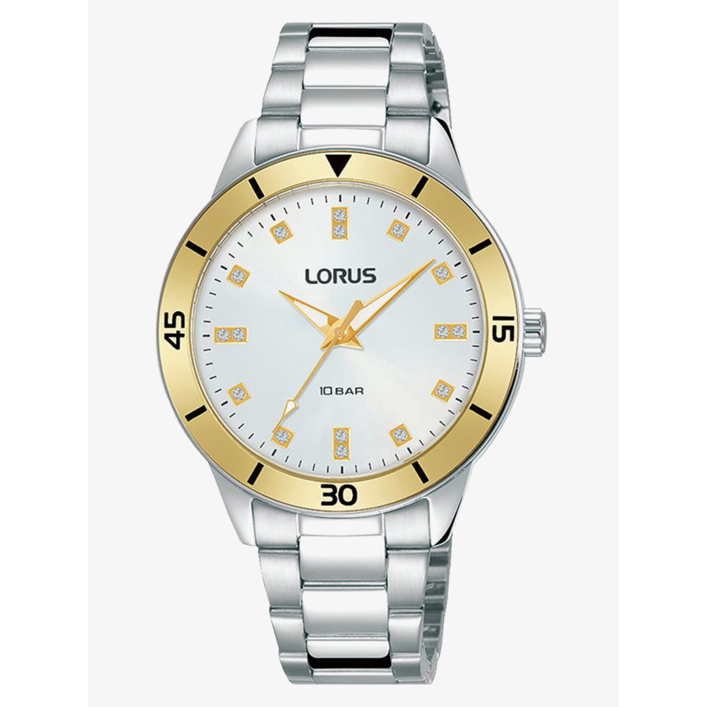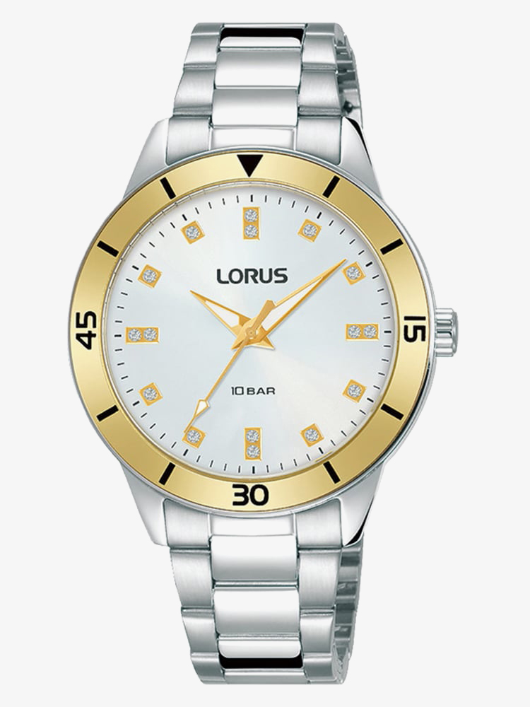 This sporty Lorus model has been crafted with a stainless steel case that features a white sunray dial with gold tone luminescent hands & sparkling stone set hour markers. This model also features a striking gold tone bezel, is 100 metres water resistant and has been finished with a stainless steel bracelet which complements it perfectly.