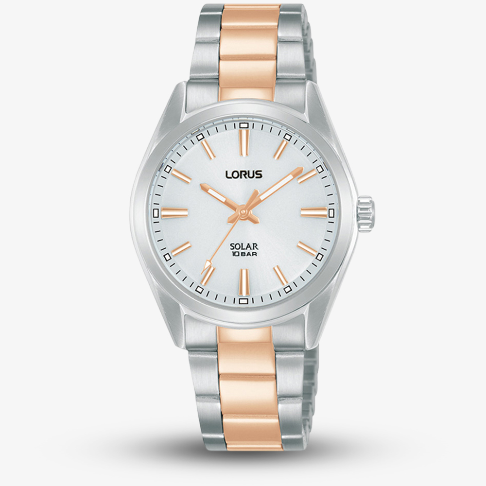 Featuring a sophisticated two-tone stainless steel design, this watch combines silver and gold tones for a timelessly chic look. The luminous white dial is adorned with gold-tone hour markers and hands, ensuring effortless readability. Powered by solar energy, this watch eliminates the need for battery replacements, offering convenience and sustainability. Perfect for both casual and formal occasions, this timepiece is a versatile and stylish accessory.