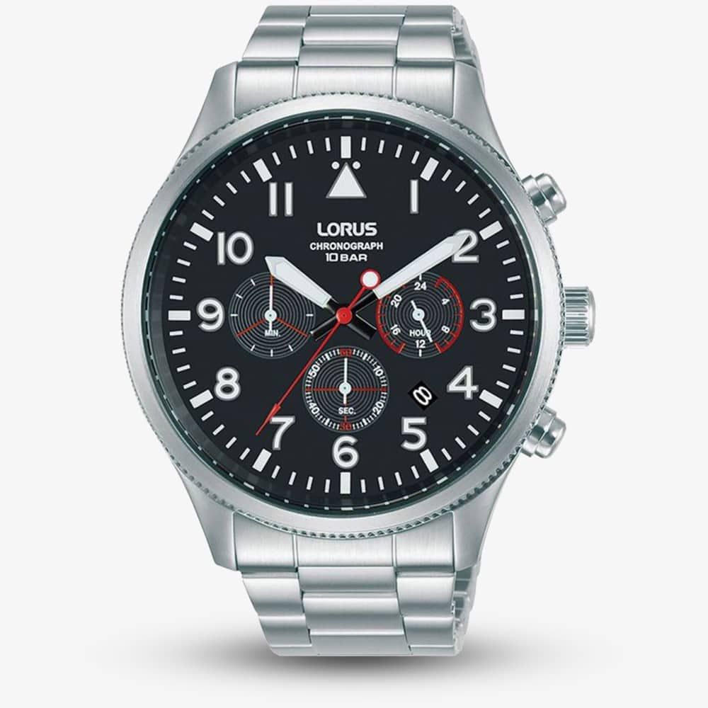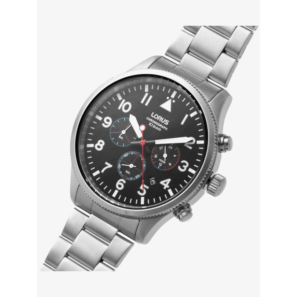 The Lorus RT363JX9 watch combines a 45 mm round shaped stainless steel case and silver stainless steel bracelet with a push button deployment clasp. It has a black dual display dial which is protected beneath mineral crystal glass. Power is generated by the quartz movement. This model also has a water resistance of up to 100 metres.