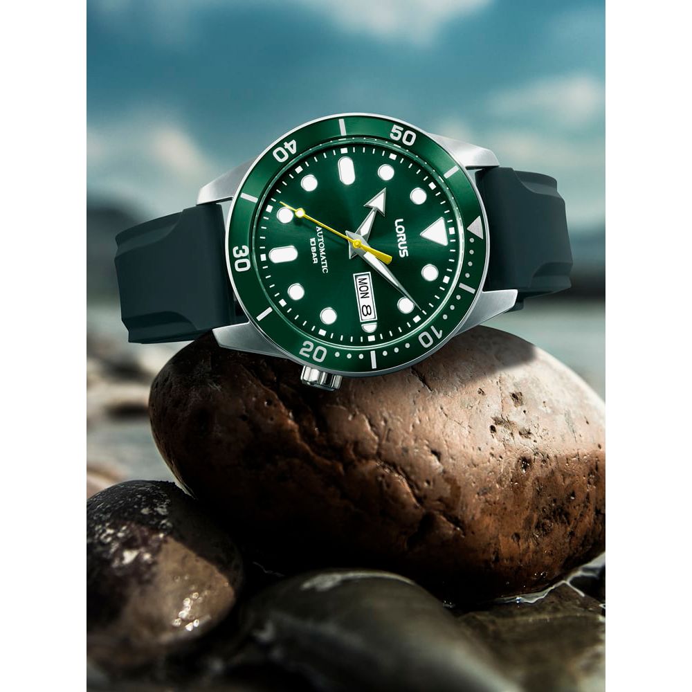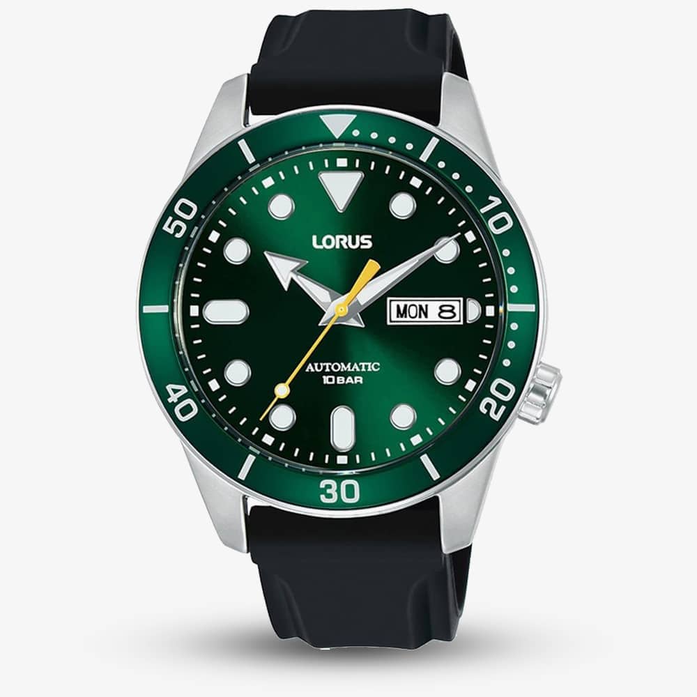 This sporty automatic Lorus model has been crafted with a stainless steel case that features a dark green sunray dial with luminescent hands and hour markers. This model also features day/date display, matching green bezel and has been finished with a black silicone strap that complements it perfectly.