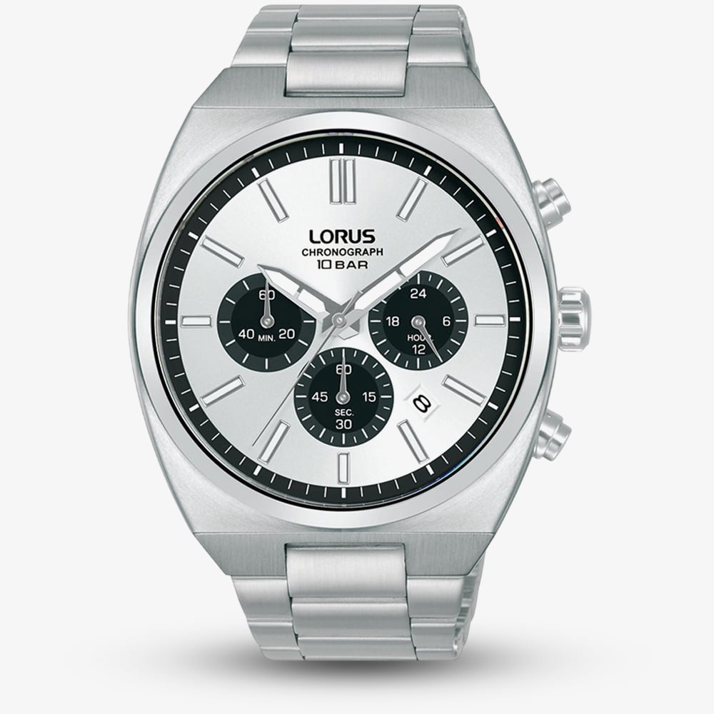 This Lorus chronograph pairs a silver sunray dial with a matching bracelet for a sleek, modern look. Featuring applied markers, dial rings, and a date window, it offers stopwatch functionality up to 30 minutes and 60 seconds, along with hour, minute, and second hands. With 100m water resistance, it’s a stylish and performance-driven choice.