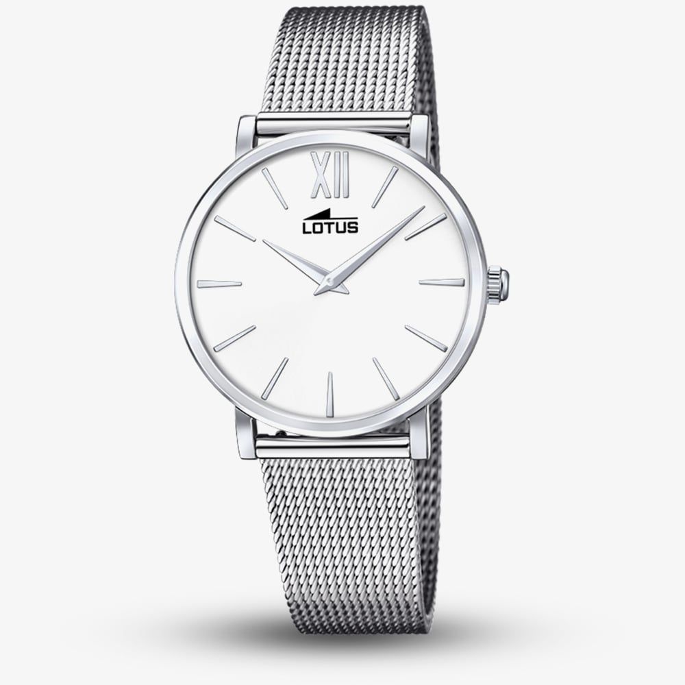 The Lotus Ladies Stainless Steel Mesh White Dial Watch is a chic and contemporary accessory that blends elegance with modern design. It features a polished stainless steel mesh bracelet and a clean white dial with minimalist hour markers for a refined look. Ideal for both day and evening wear, this watch offers timeless style with a sleek, sophisticated finish.