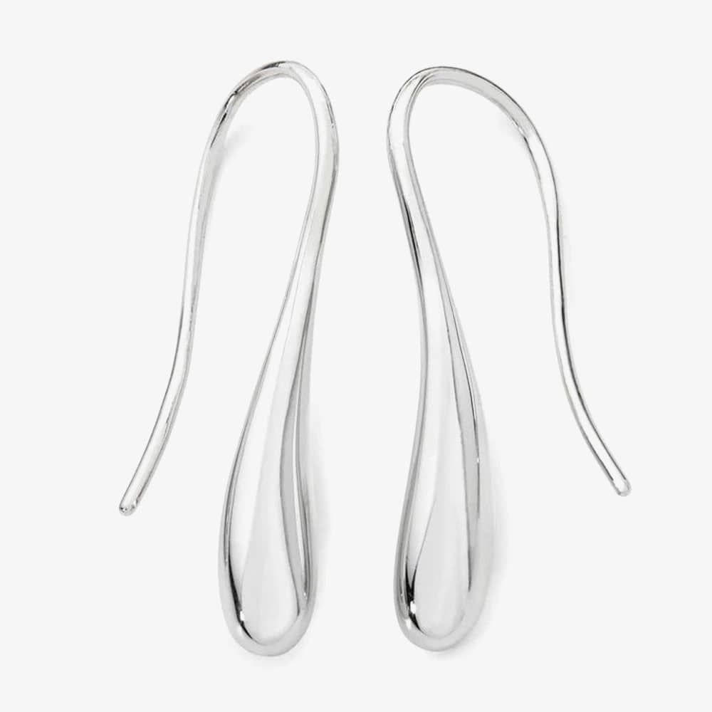 Lucy's most iconic design, these elegant earrings from the Drop collection are crafted from Sterling Silver with a Rhodium overlay. Featuring a 2.8cm drop and weighing 4.4 grams, they are designed as one fluid piece with an elongated shepherd's crook for added security. Perfect for both day and evening wear, these earrings offer a timeless and confident style.