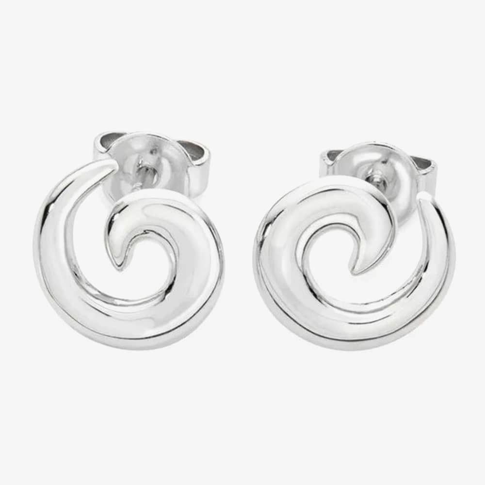 These striking Sterling Silver stud earrings feature an organic design inspired by air and wind, with each earring crafted as a mirrored opposite to frame the face beautifully. Measuring 1cm wide and weighing 8.9 grams, they are secured with a post and butterfly fastening. The Rhodium overlay enhances their shine and durability while also preventing tarnishing, these unique studs make a bold statement.