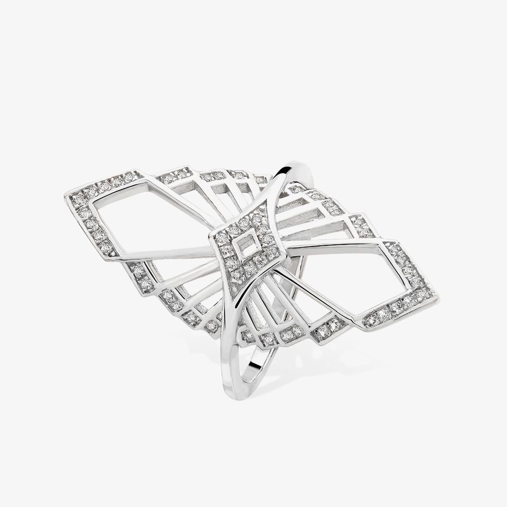 This Art Deco Mirror Chrysler Ring from the Art Deco collection radiates timeless elegance. Designed with geometric elements inspired by the iconic Chrysler Building, it is embellished with dazzling white topaz gemstones, adding a glamorous touch. Expertly crafted from 925 sterling silver with a rhodium overlay, this cocktail ring is ideal for everyday wear or special occasions. With its bold dimensions of 3.5 cm in length and 1.5 cm in width, it stands out as a captivating statement piece.