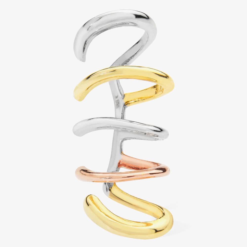 This three-colour ear cuff crafted from 925 Sterling Silver with accents of Rose Gold and Gold Vermeil, offers a stylish and hassle-free alternative, requiring no piercing. Easily adjustable to fit any ear size by hand, it provides a quick and fashionable way to adorn your ears.