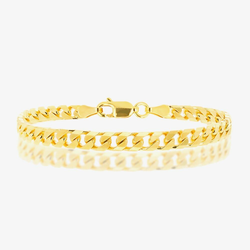 This sterling silver bracelet, plated in yellow gold, features a classic curb chain with smooth, interlocking links. Its polished, reflective finish adds a touch of sophistication, making it a versatile piece that complements any outfit.