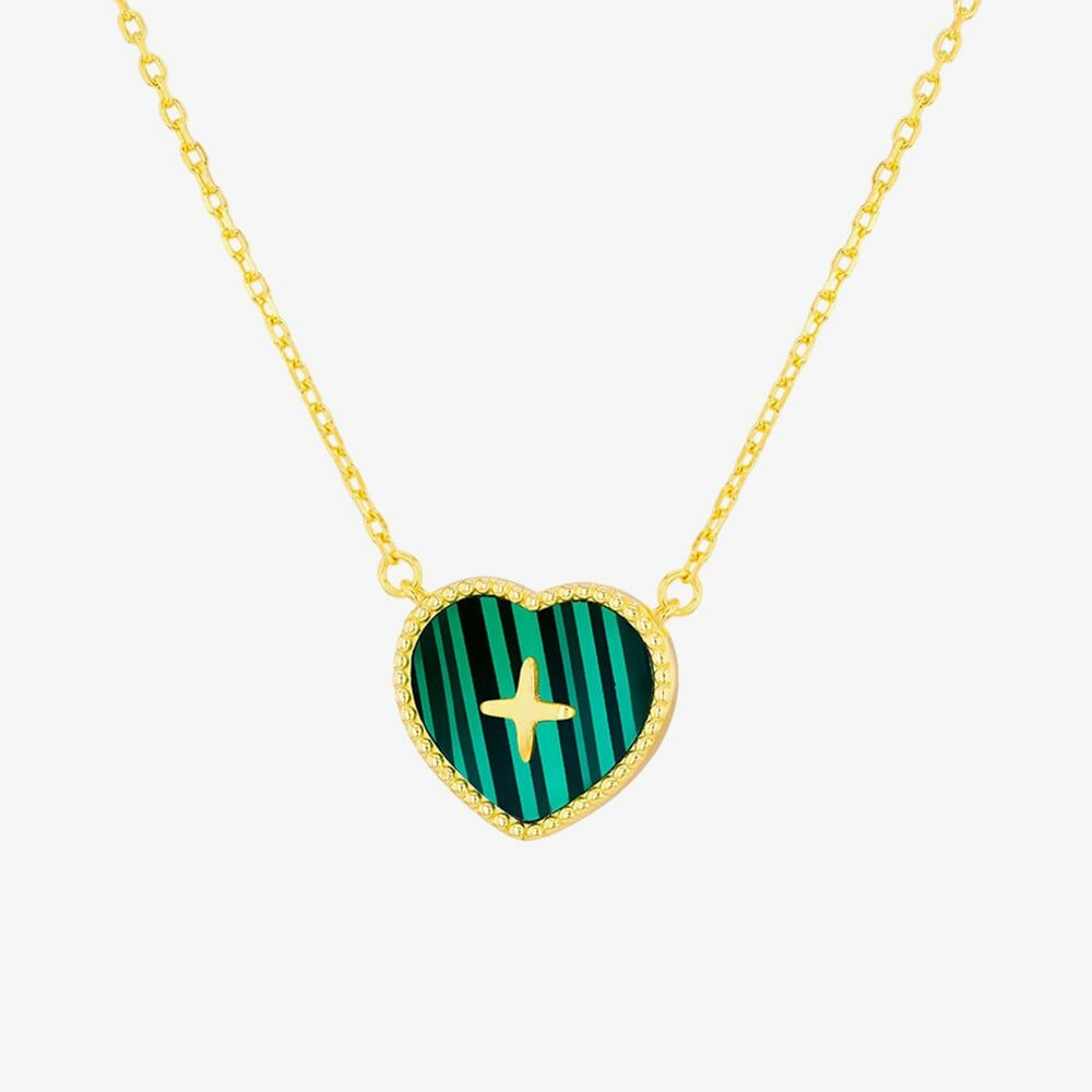 This sterling silver necklace, plated in yellow gold, features a heart-shaped malachite pendant adorned with a delicate cross detail in the centre. A meaningful and stylish accessory for any occasion.