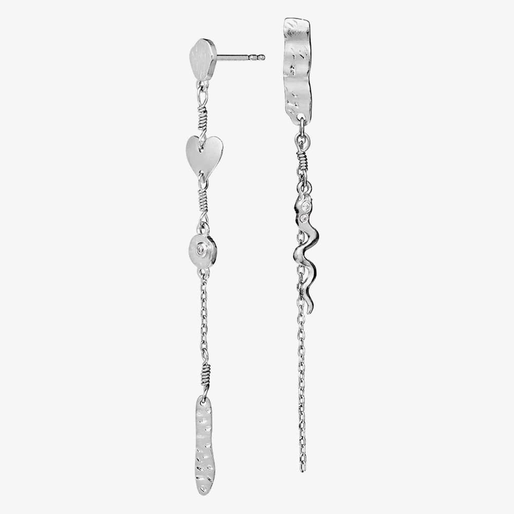 These earrings form a delicate collection of symbols tied to the goddess Artemis, guardian of the forests and mountains. Within these earrings, a small heart exudes love, while the serpent emblem embodies the essence of transformation and change. These earrings are crafted from recycled sterling silver (925).