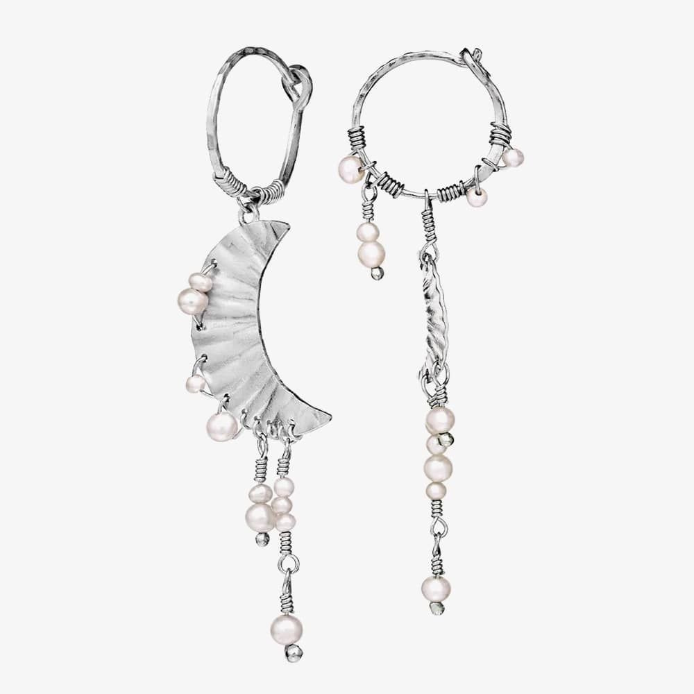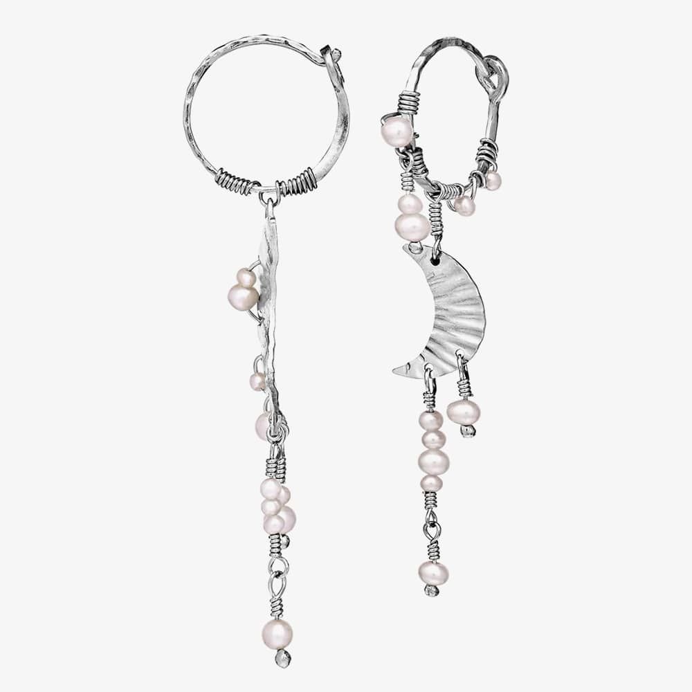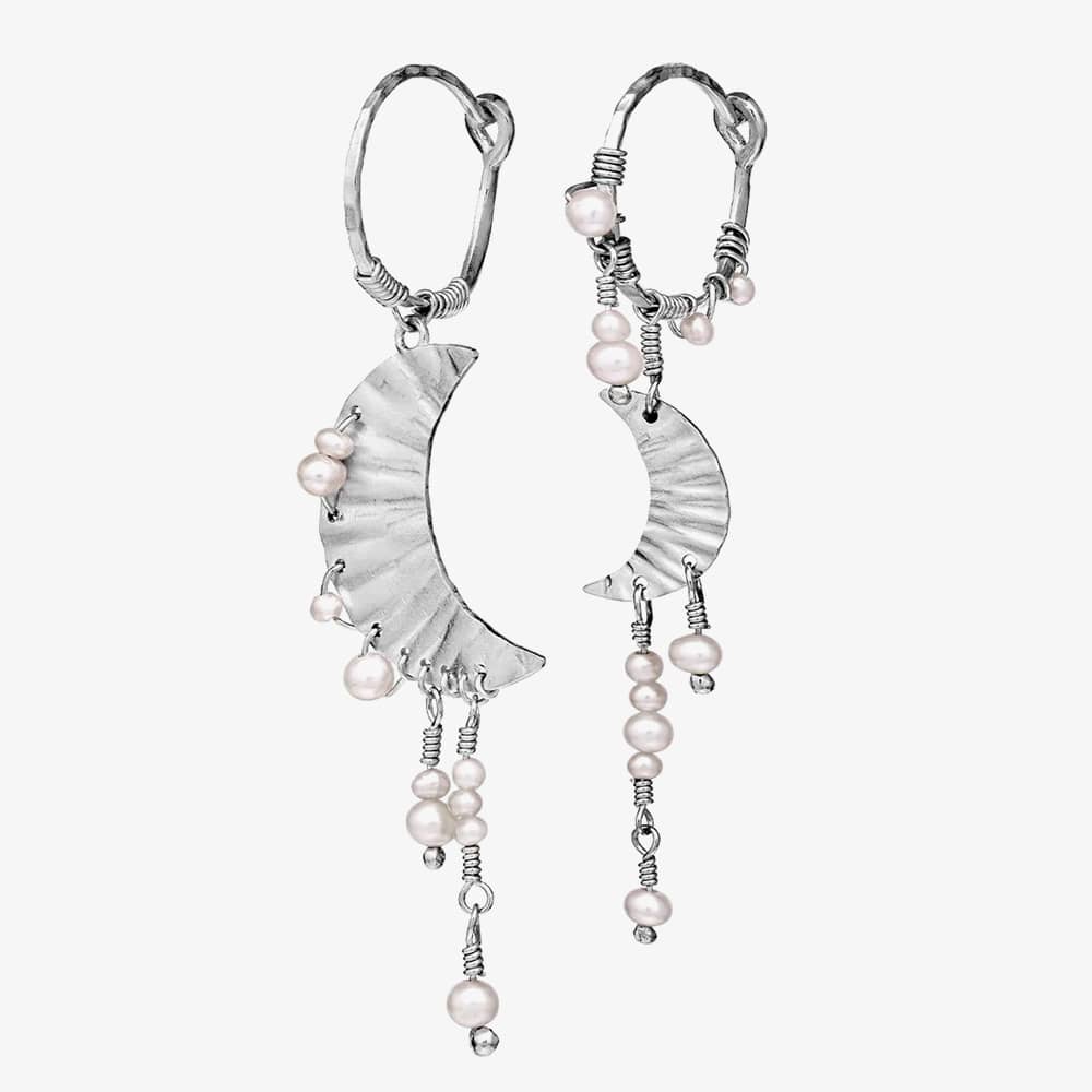 Two radiant moons dangle gracefully, adorned with freshwater pearls that glisten like frost drops in the night. Symbolic of the Greek goddess Artemis, the moon represents life, femininity, intuition, and destiny, imbuing these earrings with timeless allure and significance. These earrings are crafted from recycled sterling silver (925).