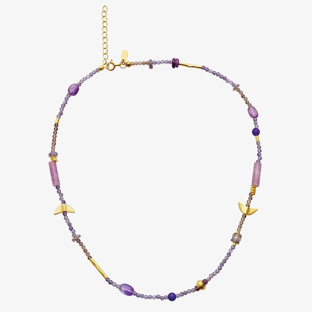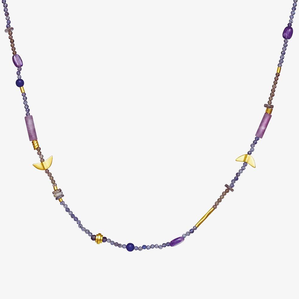 Comprising potent stones like lepidolite for balance and purple jade for luck and prosperity, the Tita Necklace features not only captivating purple tones but also incorporates small metal elements and moons that enhance the rich colour palette. The Twin Flames collection embody the captivating connection between close friends or siblings, mirroring the Sun and the Moon's enduring chase across the sky. Crafted from recycled sterling silver with 18 carat gold plating, this necklace features smoke quartz, iolite, amethyst, lepidolite and purple jade.