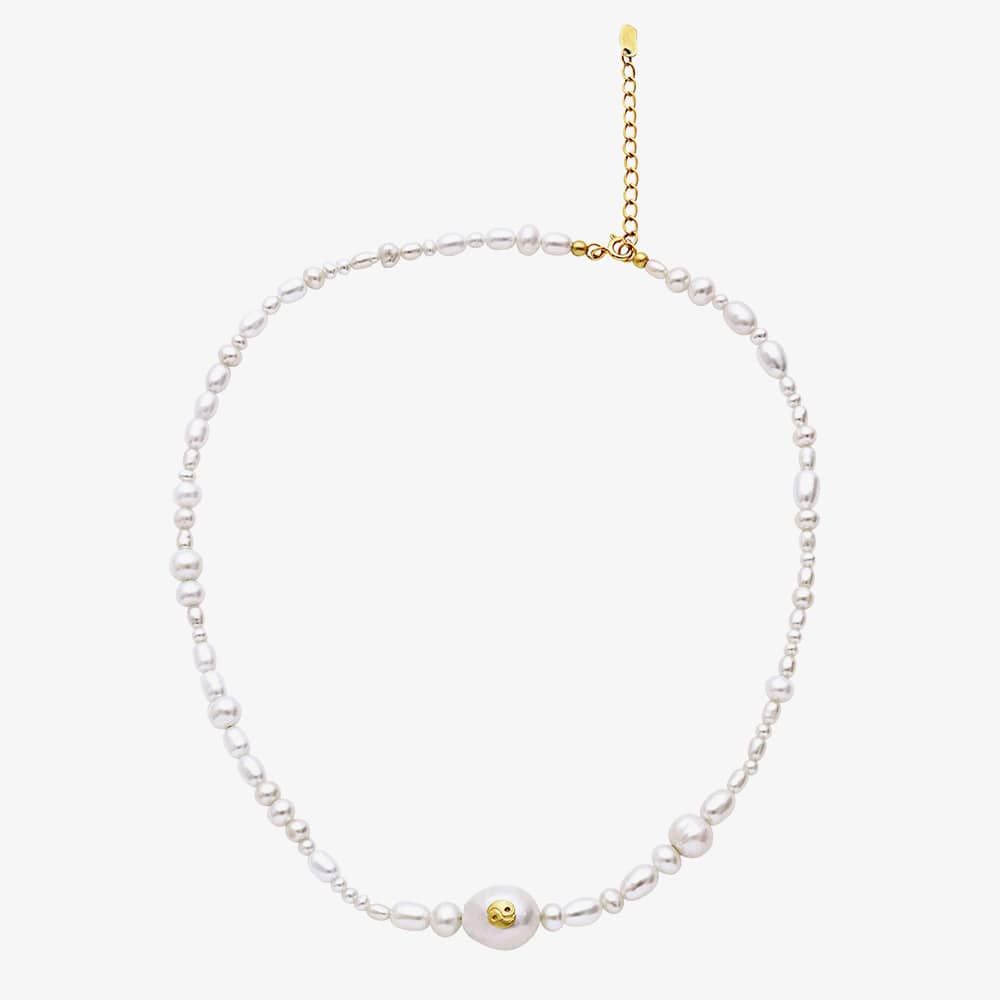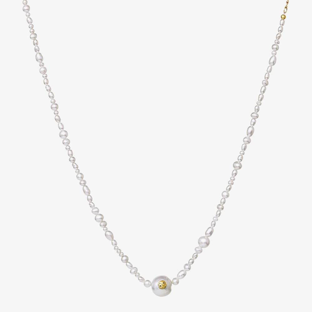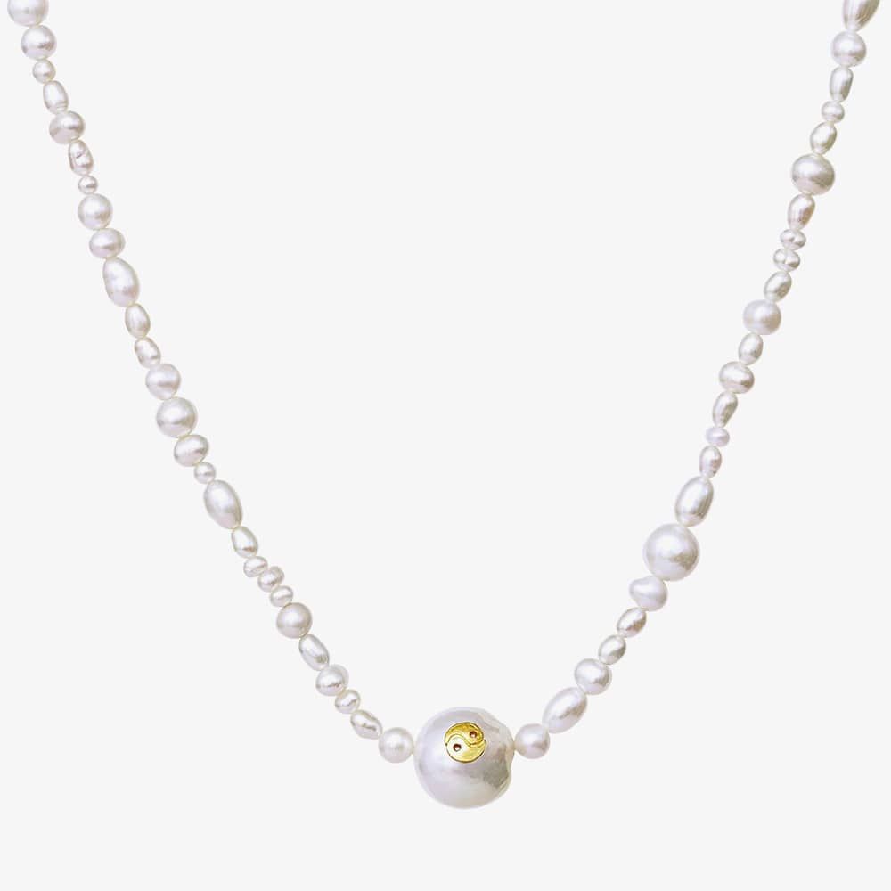 This exquisite pearl necklace is crafted from freshwater pearls of varying sizes, adorned with a Yin & Yang symbol on the central large pearl. The use of natural pearls adds a unique touch, allowing for variations in size and appearance. The necklace is crafted from recycled sterling silver (925) with 18 carat gold plating and freshwater pearls.