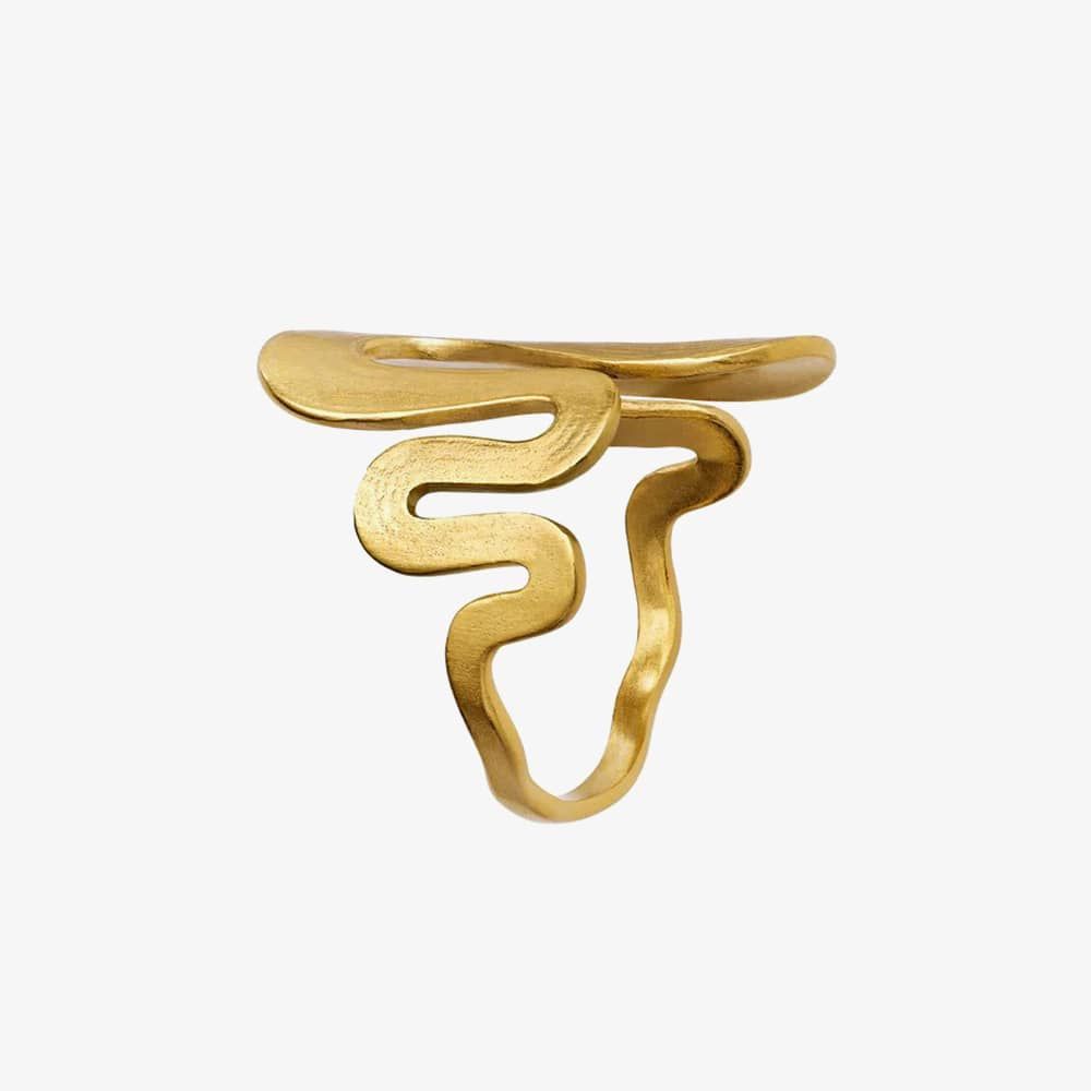 This ring is a voluminous statement piece that effortlessly infuses a cool vibe into your ensemble. The ring's organic design mimics the gentle waves of the ocean, creating a stylish and dynamic accessory that complements your fashion-forward look with ease. This ring is crafted from recycled sterling silver (925) plated in 18 carat gold.