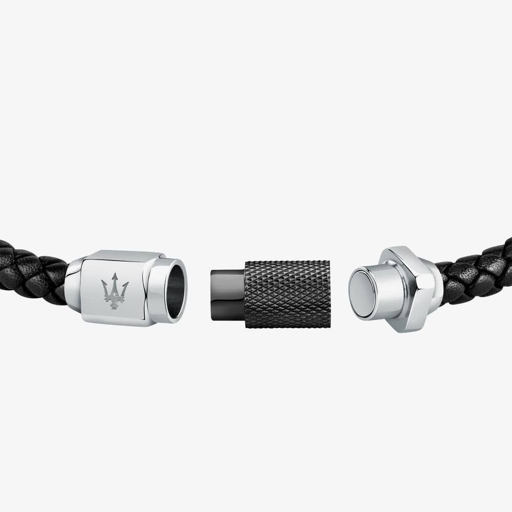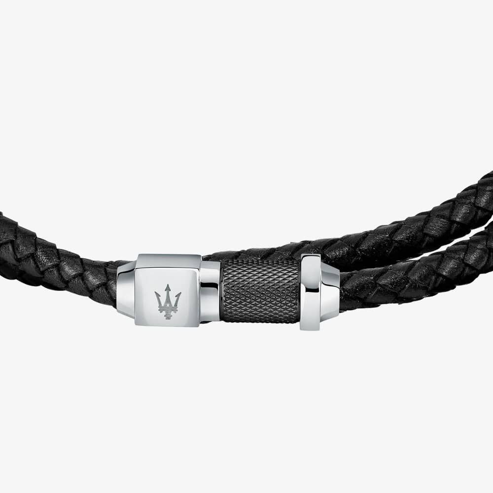 This recycled leather rope bracelet is double wrapped and features a magnetic closure for easy wear and is adorned with a striking silver Trident Logo and subtle silver and black details, adding a touch of elegance to your look.