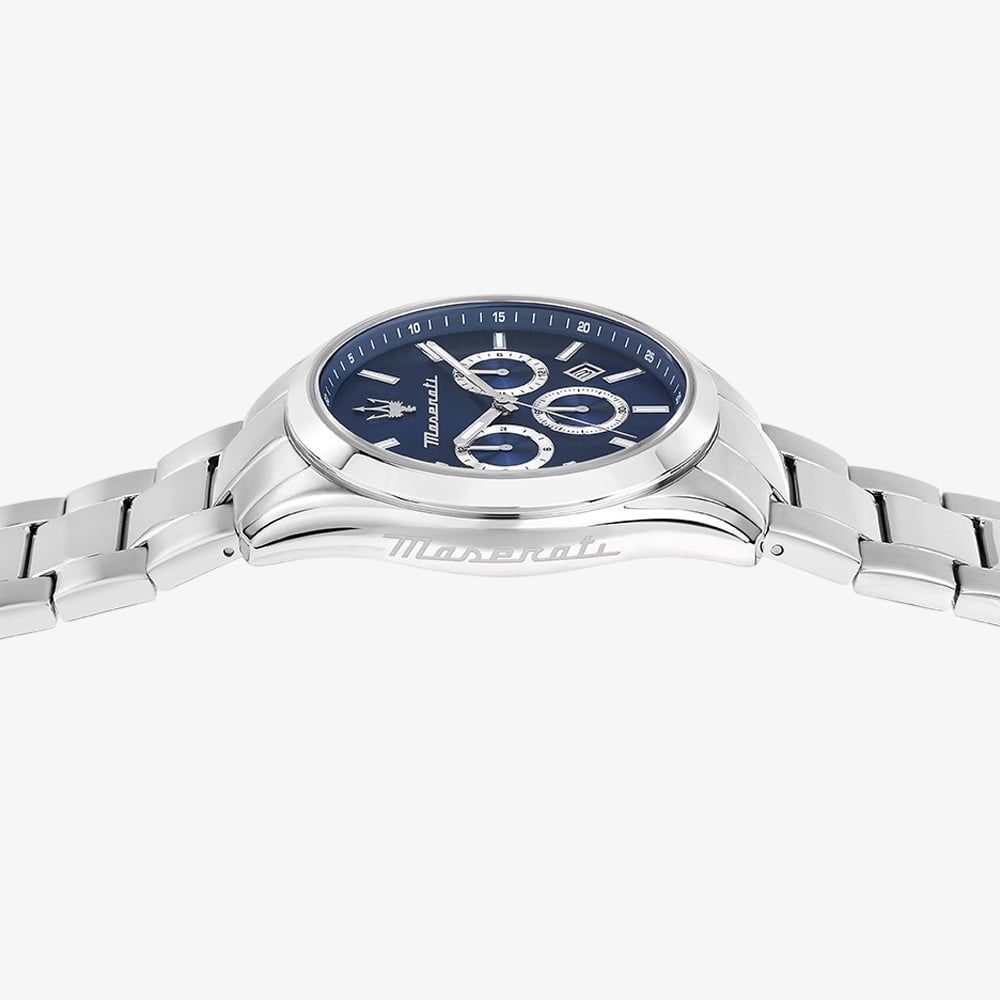 A perfect combination of sporty elegance and precision engineering. Featuring a deep blue dial with sophisticated chronograph sub-dials, this timepiece offers both style and functionality. Made from durable stainless steel, it exudes a sleek and modern appeal, while the Maserati trident logo adds a signature touch of luxury. The watch is designed for versatility, making it suitable for both casual and formal occasions.