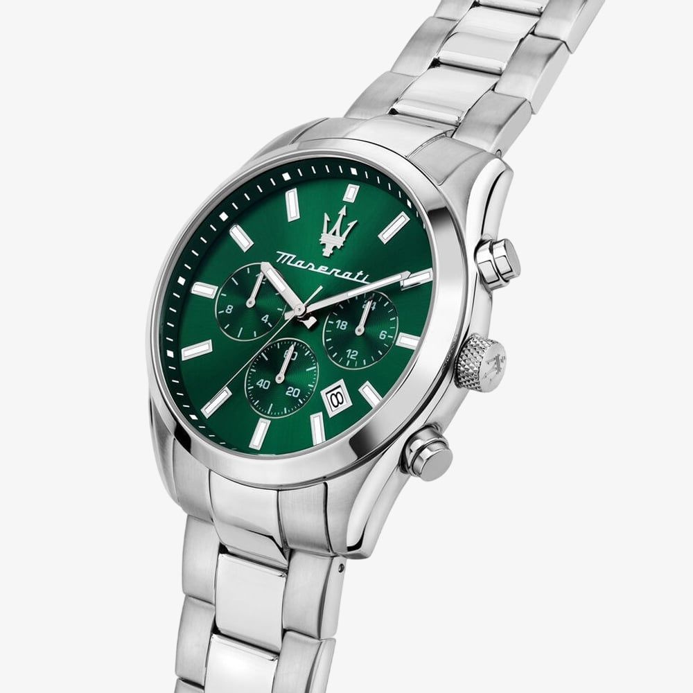 A dynamic and eye-catching chronograph watch that seamlessly blends sporty aesthetics with refined elegance.The watch boasts a captivating green dial, providing a unique and energetic backdrop for the chronograph subdials and luminous hands. This distinctive colour adds a touch of personality and sets it apart from traditional timepieces.Crafted from high-quality stainless steel, the case and bracelet provide durability, a polished finish, and a comfortable fit. The robust construction ensures the watch can withstand daily wear. This watch also comes with a stylish Maserati stainless steel bracelet to complete the gift set.