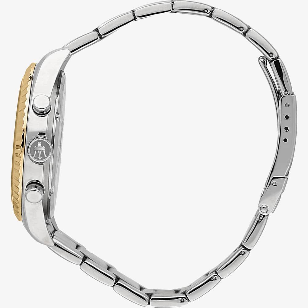 The Maserati R8853100021 watch combines a 43mm round shaped stainless steel case with a lug width of 22mm and a two colour stainless steel bracelet with a push button deployment clasp. It has a silver analogue dial with a date display, and chronograph sub-dials which is protected beneath mineral crystal glass. Power is generated by the Japanese Miyota quartz movement. This model also has a water resistance of up to 100 metres.