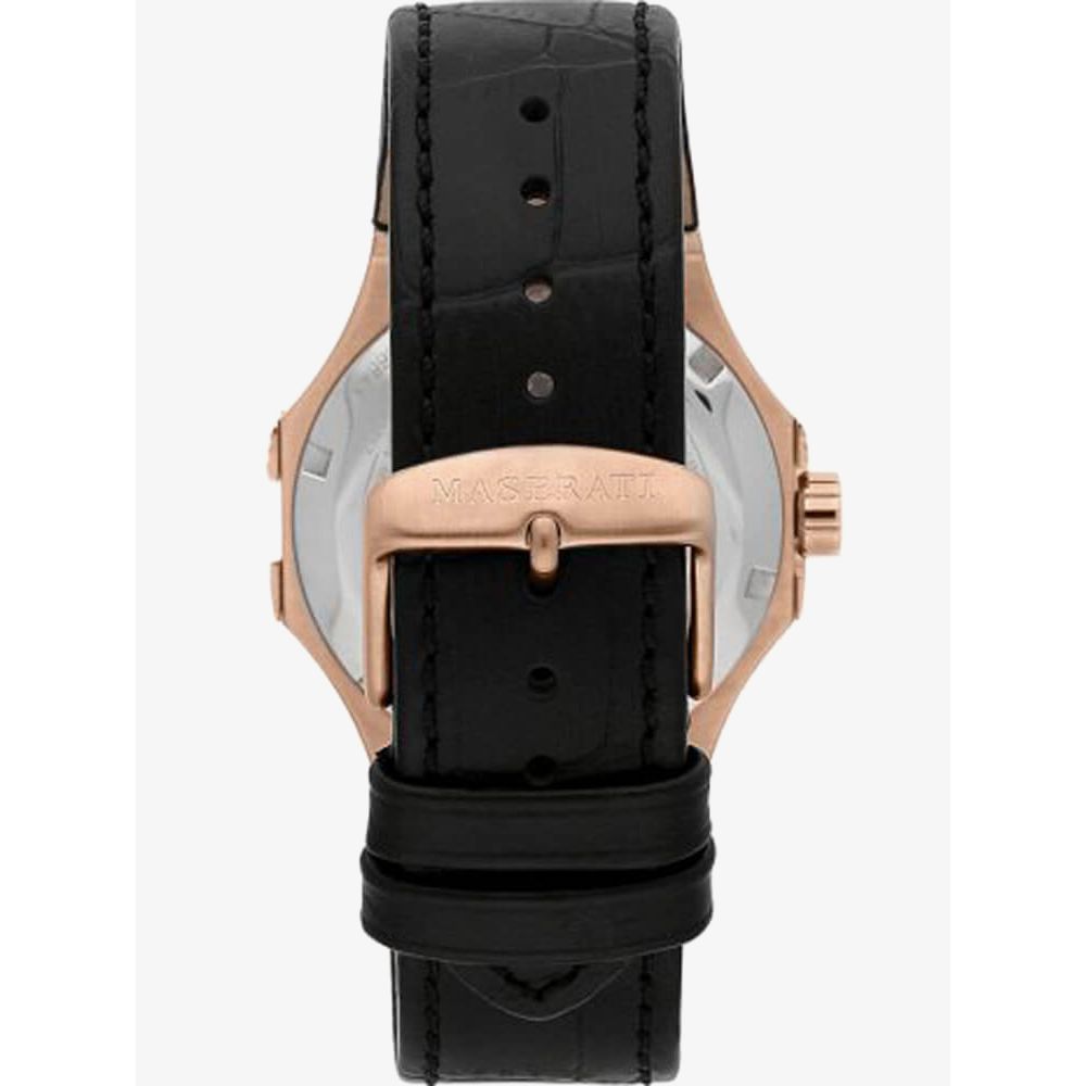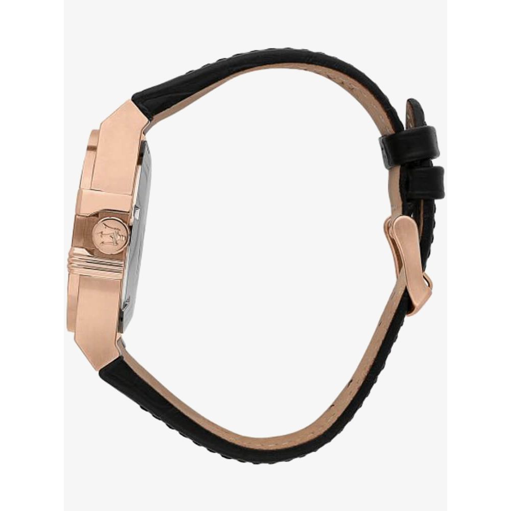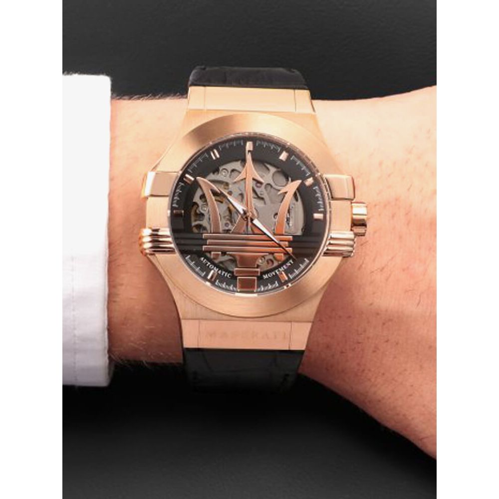 The Maserati Mens Potenza Watch R8821108053 combines a 42mm round shaped rose gold tone stainless steel case and a black leather strap with a traditional buckle fastening. It has a skeleton analogue dial with rose gold tone trident logo detailing, which is protected beneath sapphire crystal glass. Power is generated by the automatic movement. This model also has a water resistance of up to 100 metres.
