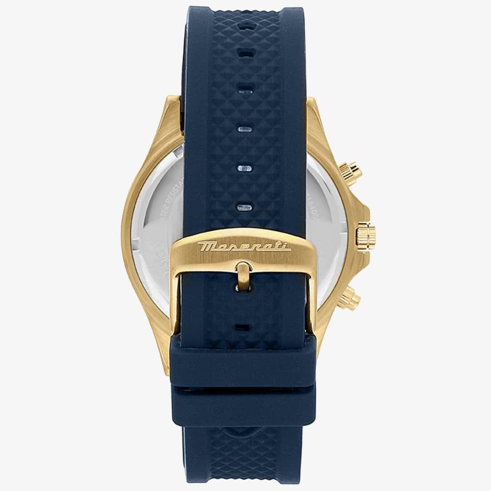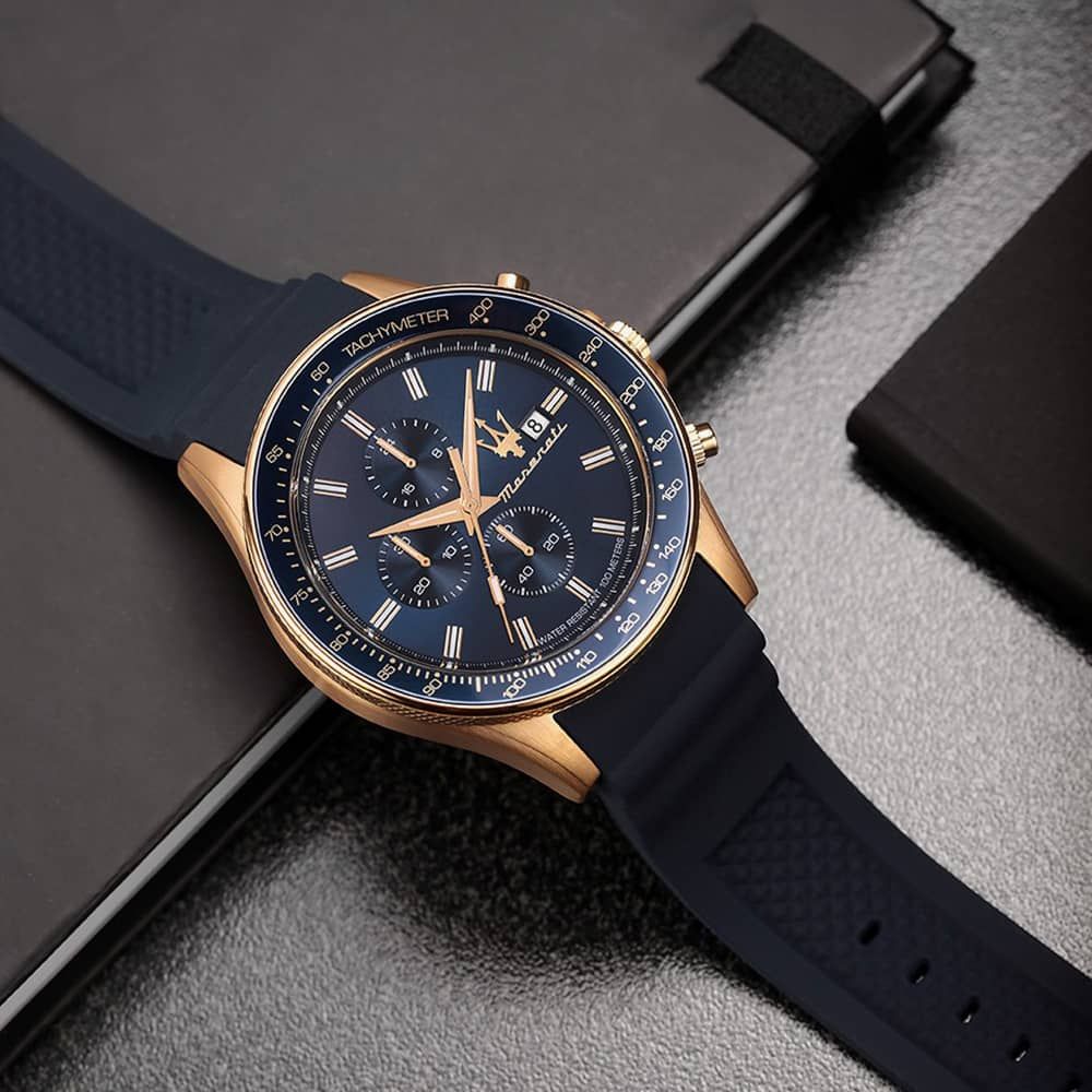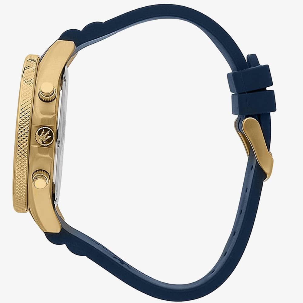 The Maserati R8871640004 watch combines a 44mm round shaped stainless steel case with a lug width of 22mm and a blue rubber strap with a traditional buckle. It has a blue analogue dial with luminescent hands, a date display, chronograph sub-dials, and a tachymeter scale which is protected beneath mineral crystal glass. Power is generated by the Japanese Miyota quartz movement. This model also has a water resistance of up to 100 metres.