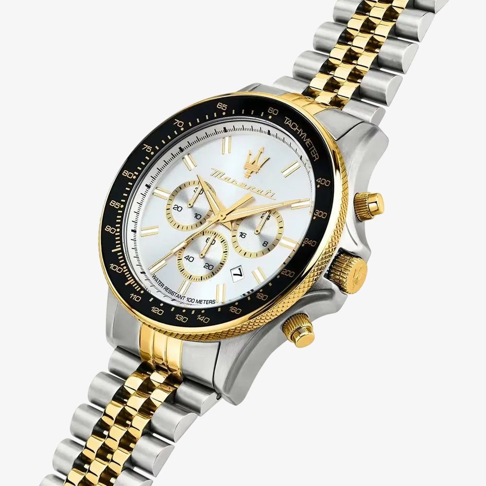 A bold timepiece inspired by the luxury and performance of the Maserati brand. Featuring a striking two-tone design, the stainless steel case and bracelet are accented with gold-tone details, creating a sophisticated and sporty aesthetic. The black dial is intricately detailed, showcasing three chronograph sub-dials, a date display, and the iconic Maserati logo, embodying the brand's heritage and style. Luminous hands and markers ensure excellent readability. Powered by a precise quartz movement, this watch offers reliable performance and accuracy. This timepiece is water-resistant up to 100 meters, making it as practical as it is stylish.