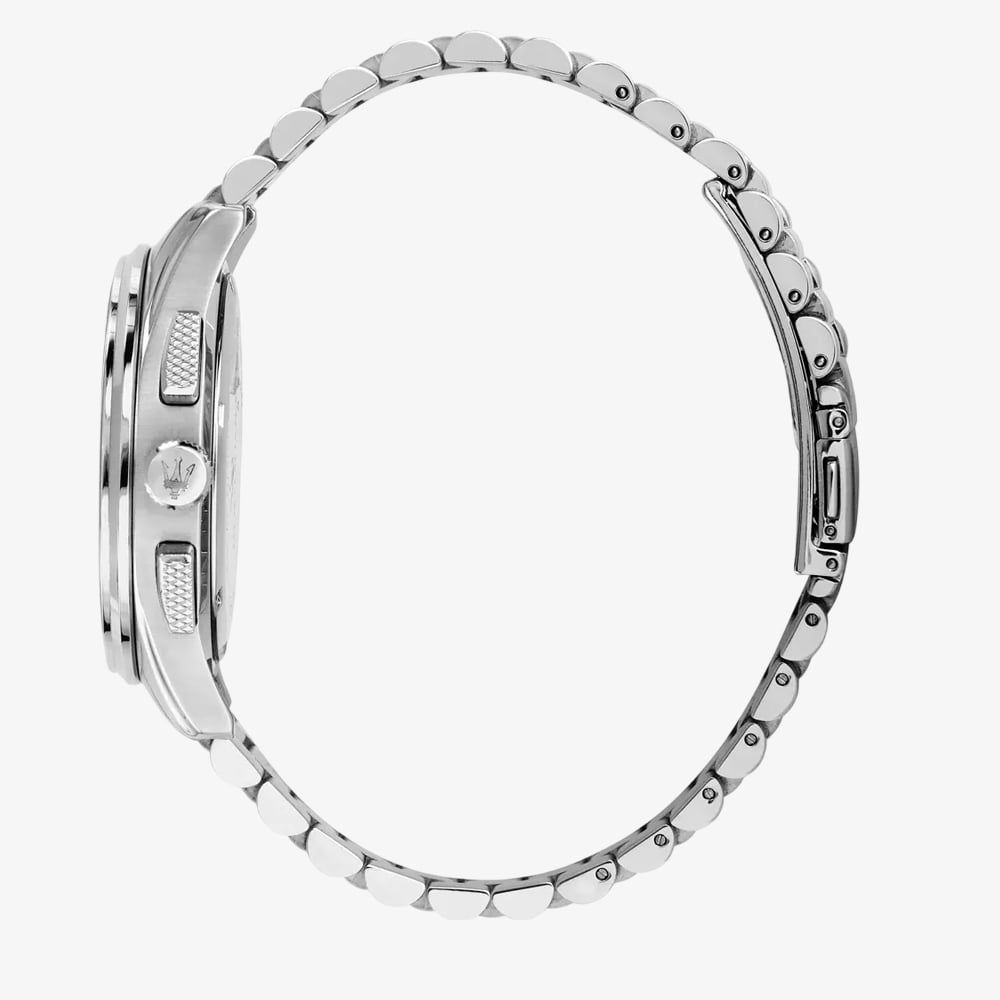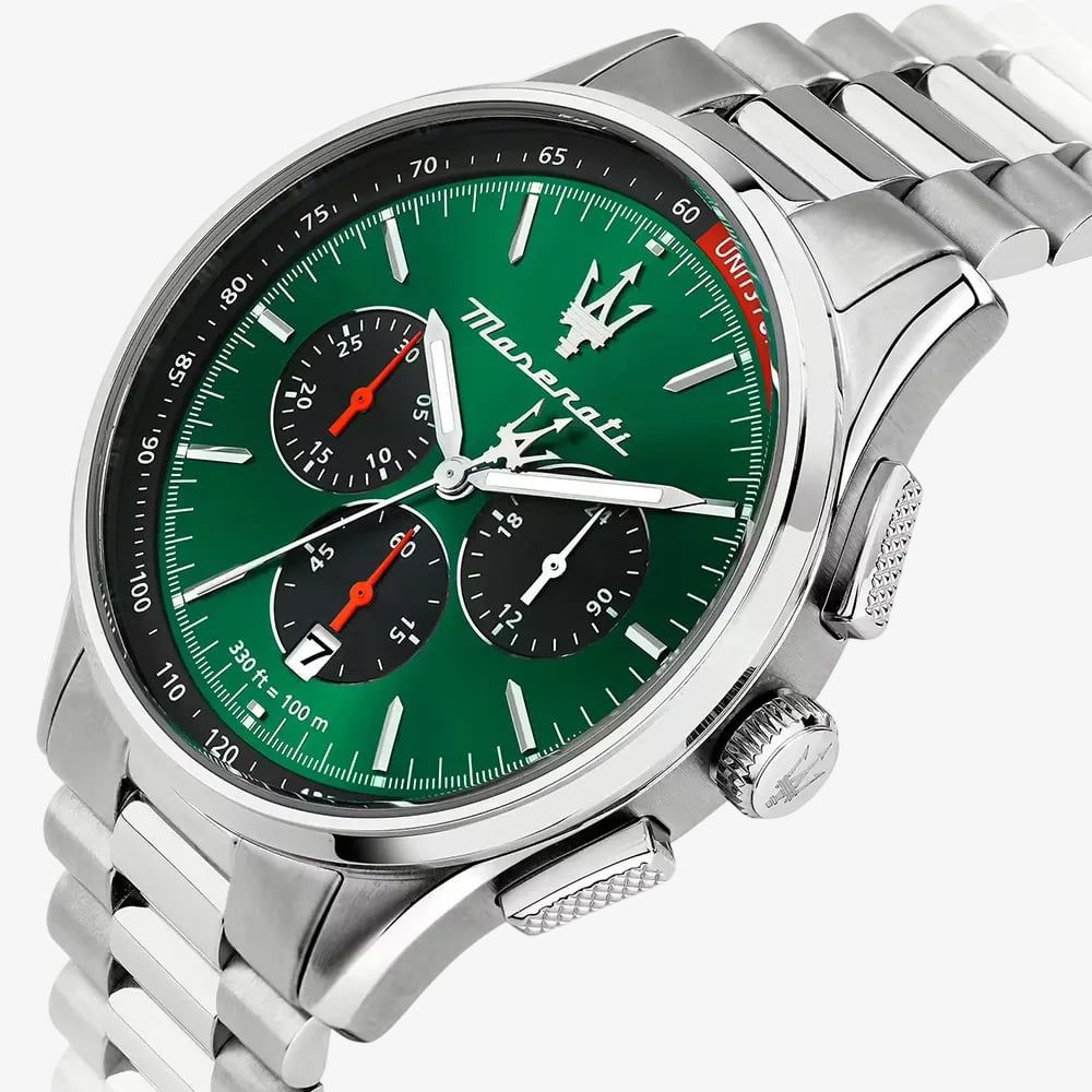 A striking chronograph watch that perfectly embodies Maserati racing heritage and refined Italian style.The centrepiece of this watch is its captivating green dial, offering a unique and sporty aesthetic. The rich green provides a bold contrast to the chronograph subdials and luminous hands. The robust stainless steel case provides durability and a polished finish, ensuring the watch can withstand daily wear. This watch also comes with a sophisticated and stylish leather strap for a contrasting style.