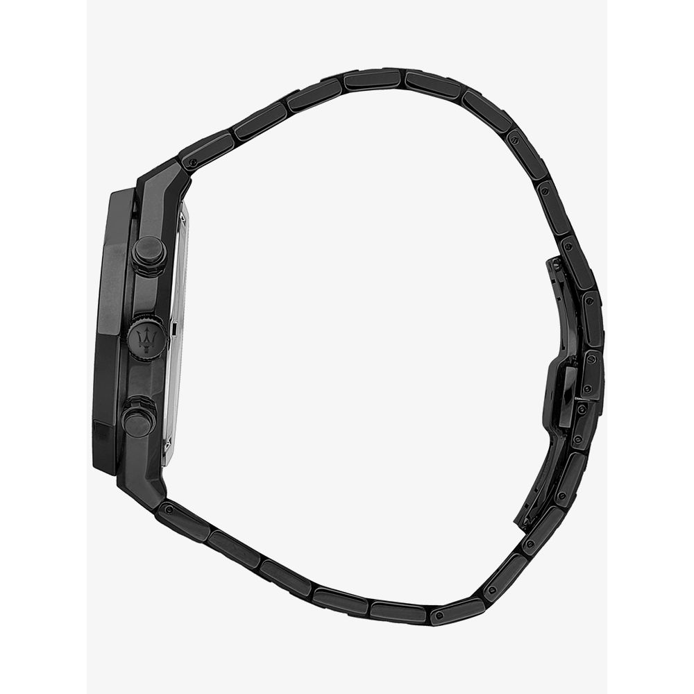 Maserati Mens Stile Black Chronograph Watch R8873642005 watch combines a 45mm round shaped stainless steel case and black stainless steel bracelet with a push button deployment clasp. It has a black analogue dial which is protected beneath mineral crystal glass. Power is generated by the quartz movement. This model also has a water resistance of up to 100 metres.