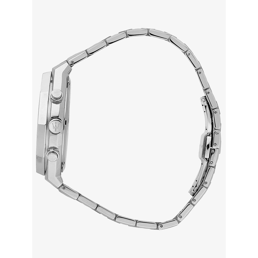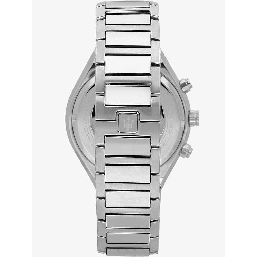 Maserati Mens Stile Blue Dial Chronograph R8873642006 watch combines a 45mm round shaped stainless steel case and silver stainless steel bracelet with a push button deployment clasp. It has a blue analogue dial which is protected beneath mineral crystal glass. Power is generated by the quartz movement. This model also has a water resistance of up to 100 metres.