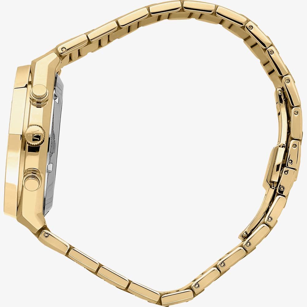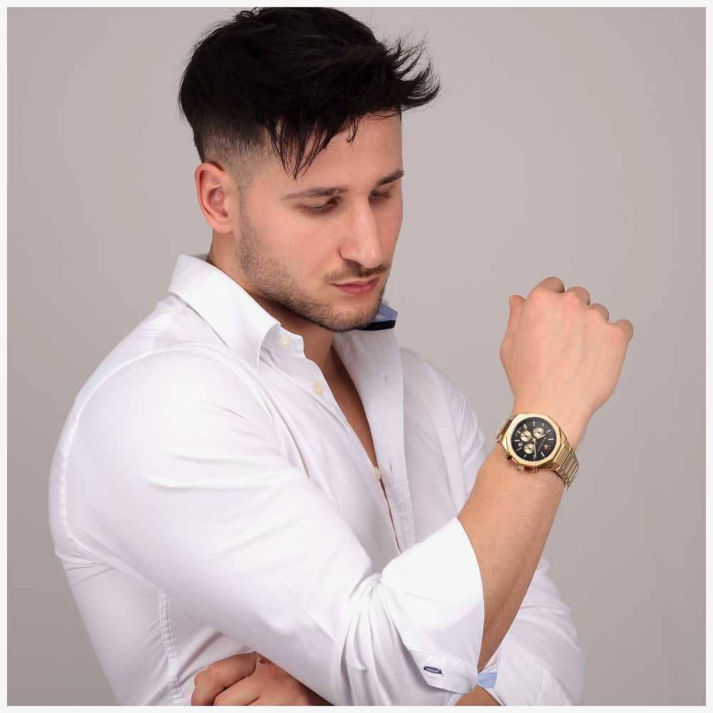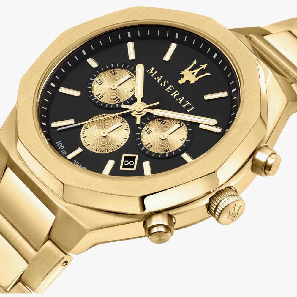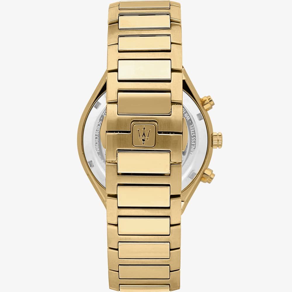 The Maserati R8873642001 watch combines a 45mm round shaped stainless steel case with a lug width of 20mm and a gold stainless steel bracelet with a push button deployment clasp. It has a black analogue dial with luminescent hands, a date display, and chronograph sub-dials which is protected beneath mineral crystal glass. Power is generated by the Japanese Miyota quartz movement. This model also has a water resistance of up to 100 metres.