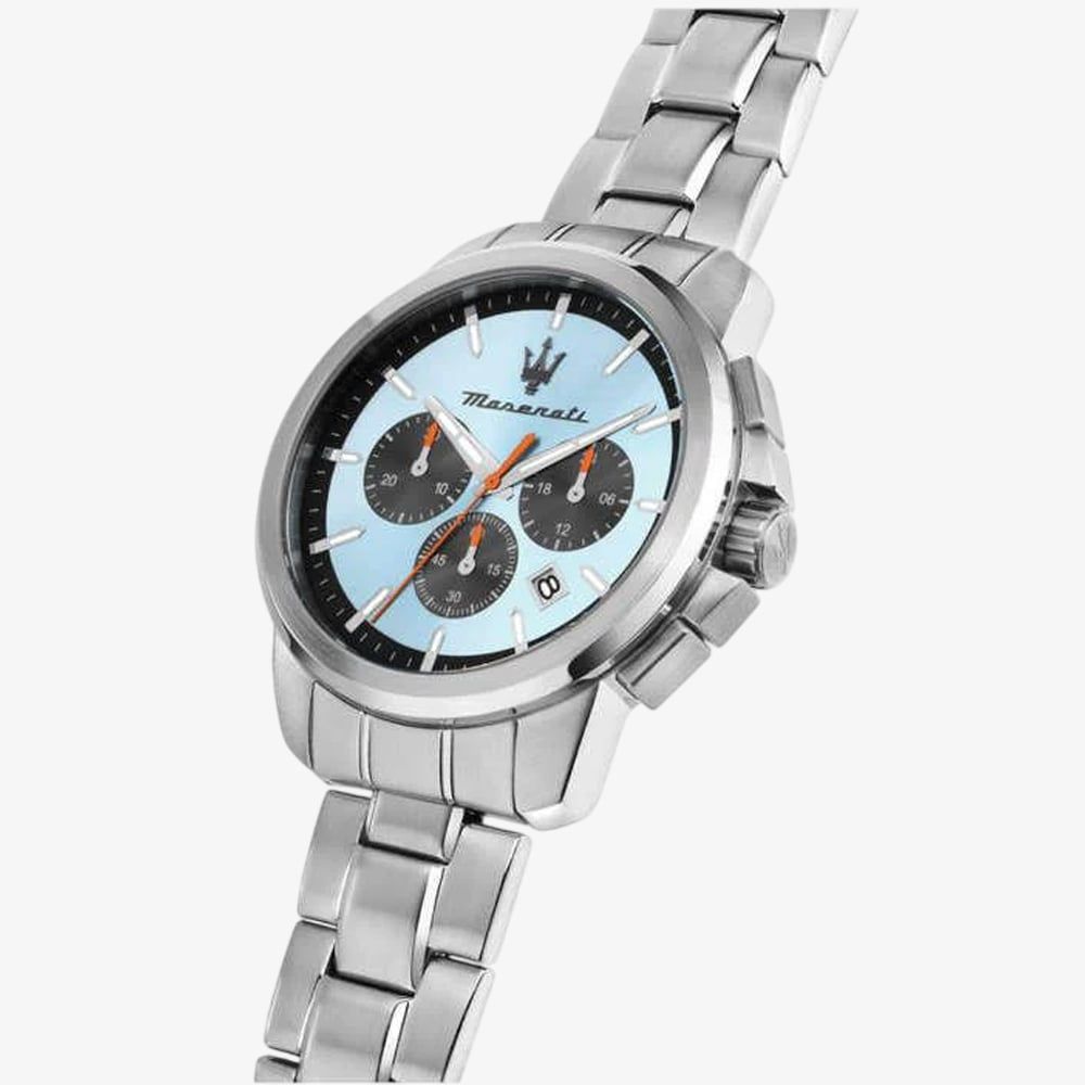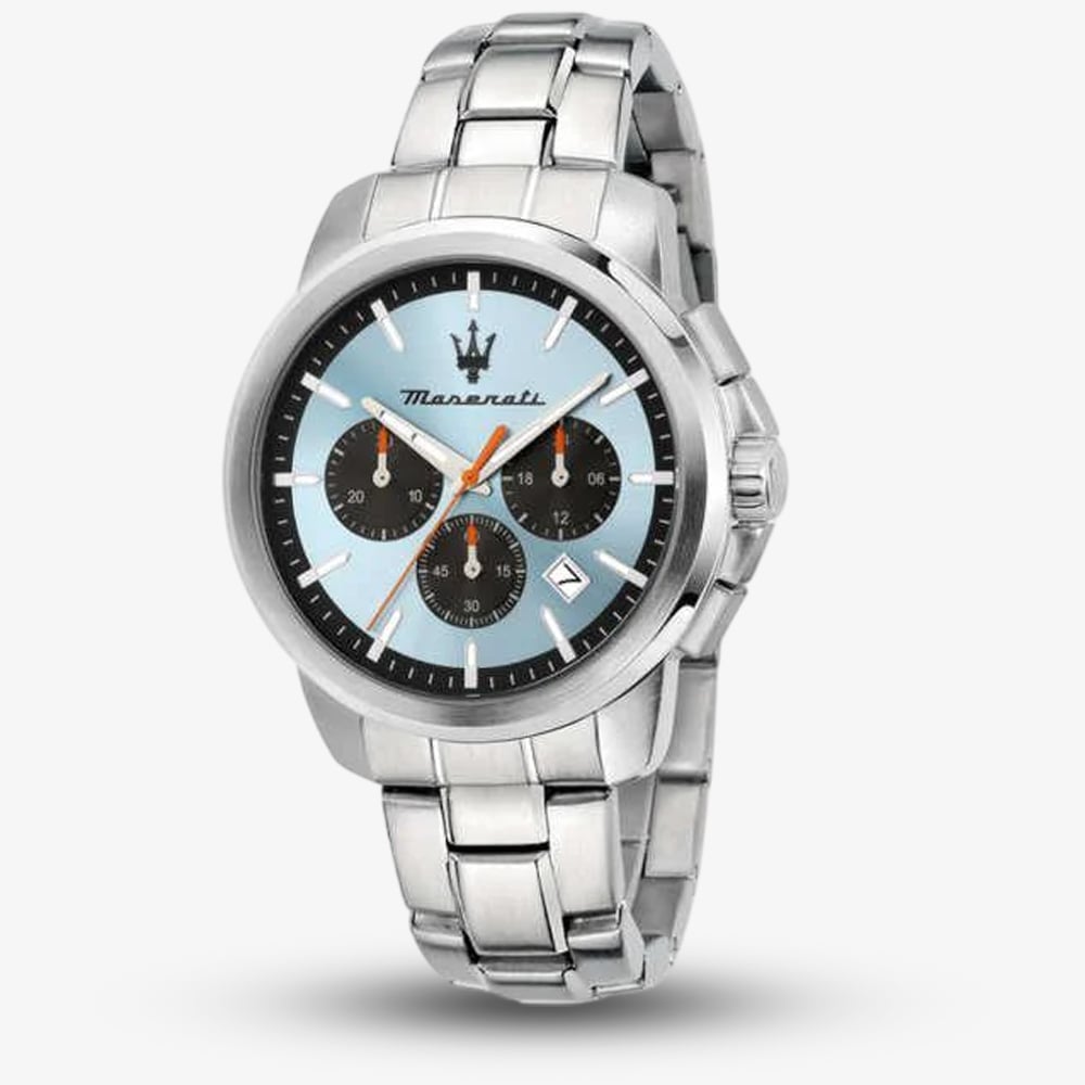 A perfect fusion of sporty sophistication and precision engineering. Featuring a bold blue dial with chronograph sub-dials, this timepiece offers both style and functionality. The stainless steel case ensures durability, while the iconic Maserati trident logo adds a touch of luxury. Designed for versatility, the watch is complemented by a comfortable strap, making it suitable for any occasion, from casual outings to formal events.
