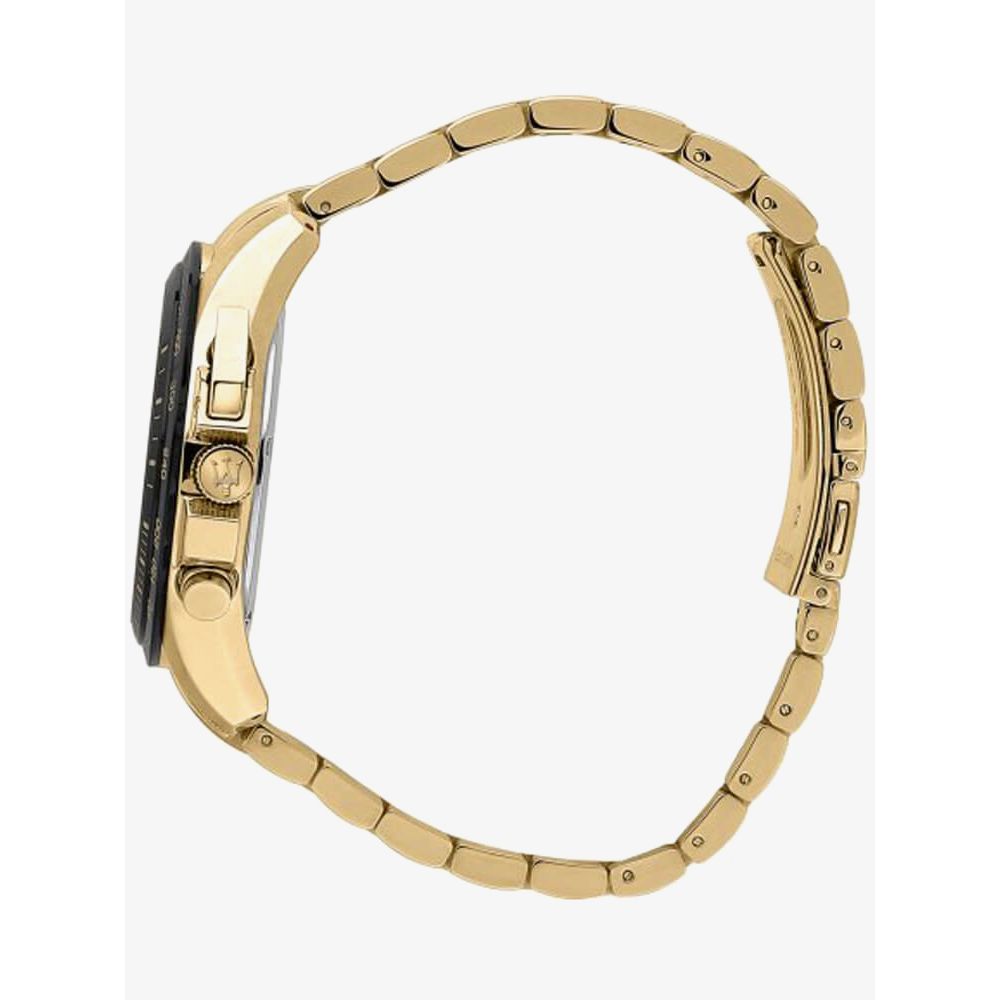 The Maserati Mens Traguardo Watch R8873612041 combines a 45mm round shaped gold tone stainless steel case and a gold tone stainless steel bracelet with a push button deployment clasp. It has a black chronograph display dial with a date window between four and five o-clock, which is protected beneath mineral crystal glass. Power is generated by the quartz movement. This model also has a tachymeter function and has a water resistance of up to 100 metres.