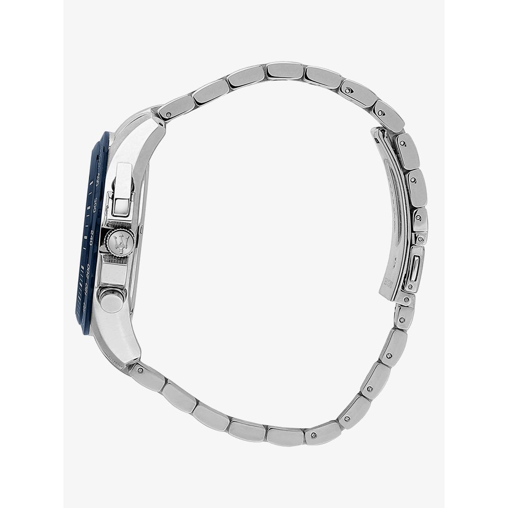 Maserati Mens Traguardo R8873612043 watch combines a 45mm round shaped stainless steel case and silver stainless steel bracelet with a push button deployment clasp. It has a blue analogue dial which is protected beneath mineral crystal glass. Power is generated by the quartz movement. This model also has a water resistance of up to 100 metres.