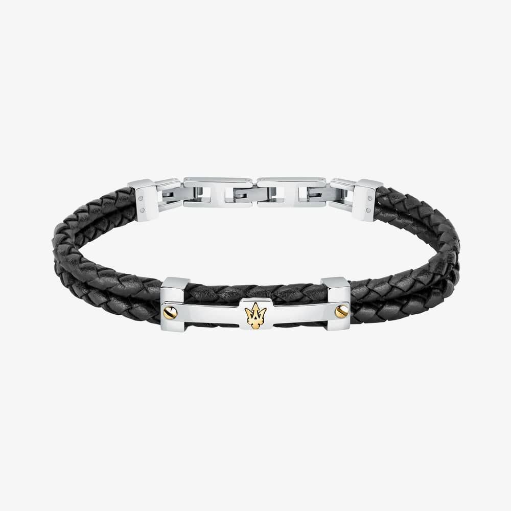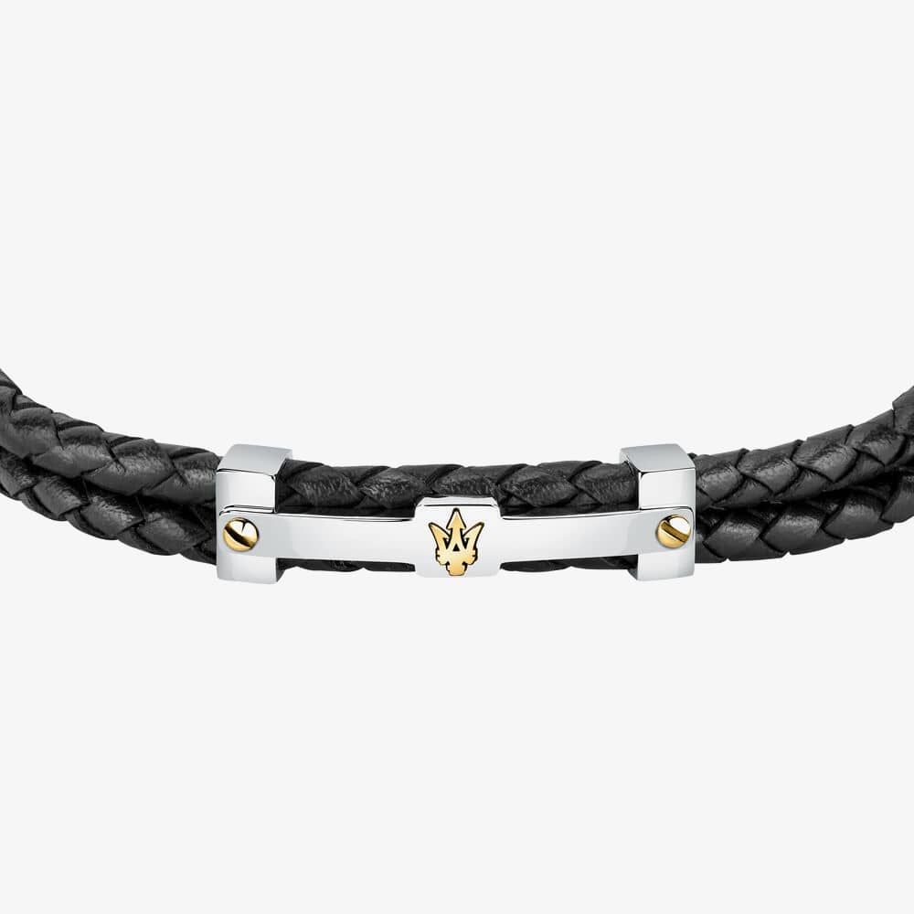Crafted from recycled leather in deep black, this bracelet exudes sophistication and eco-conscious elegance. Its stainless-steel clasp and intricate detailing provide durability and a contemporary edge, while the yellow gold accents add a touch of luxury.