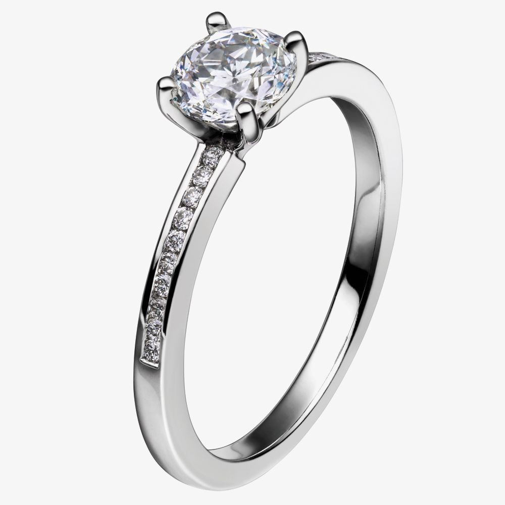 The Simplicity Four Claw collection features matching earrings, pendants and rings. This solitaire diamond ring is crafted from 18ct White Gold and features diamond channel set shoulders.