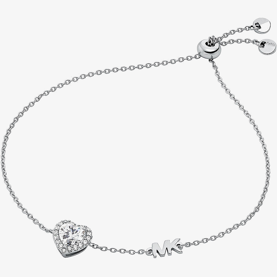 A beautiful & delicate silver chain bracelet crafted with a sparkling cubic zirconia heart cluster design with th MK logo. This bracelet can be adjusted to suit your style with a toggle fastening.