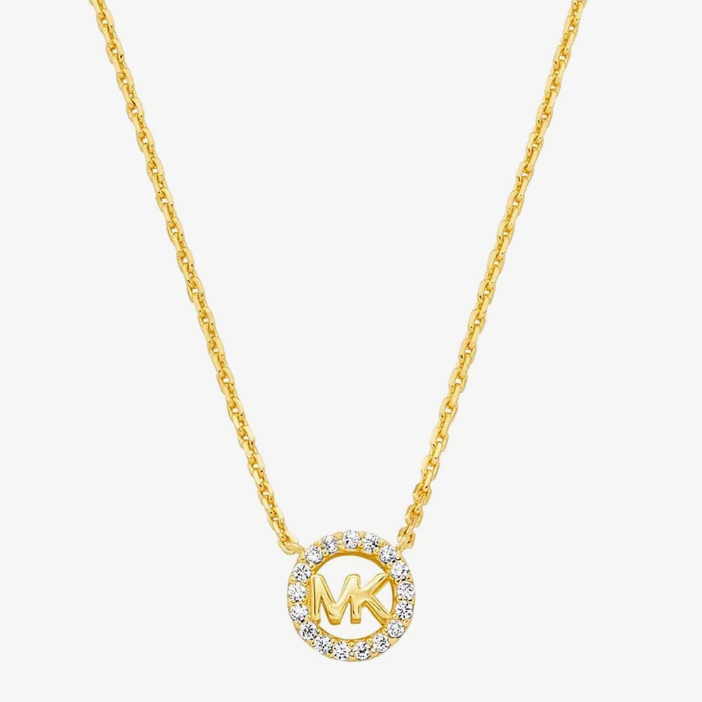 This sterling silver gold plated necklace features a circular pendant filled with cubic zirconia stones surrounding the iconic MK logo. This elegant necklace adds a touch of glamour to any outfit.