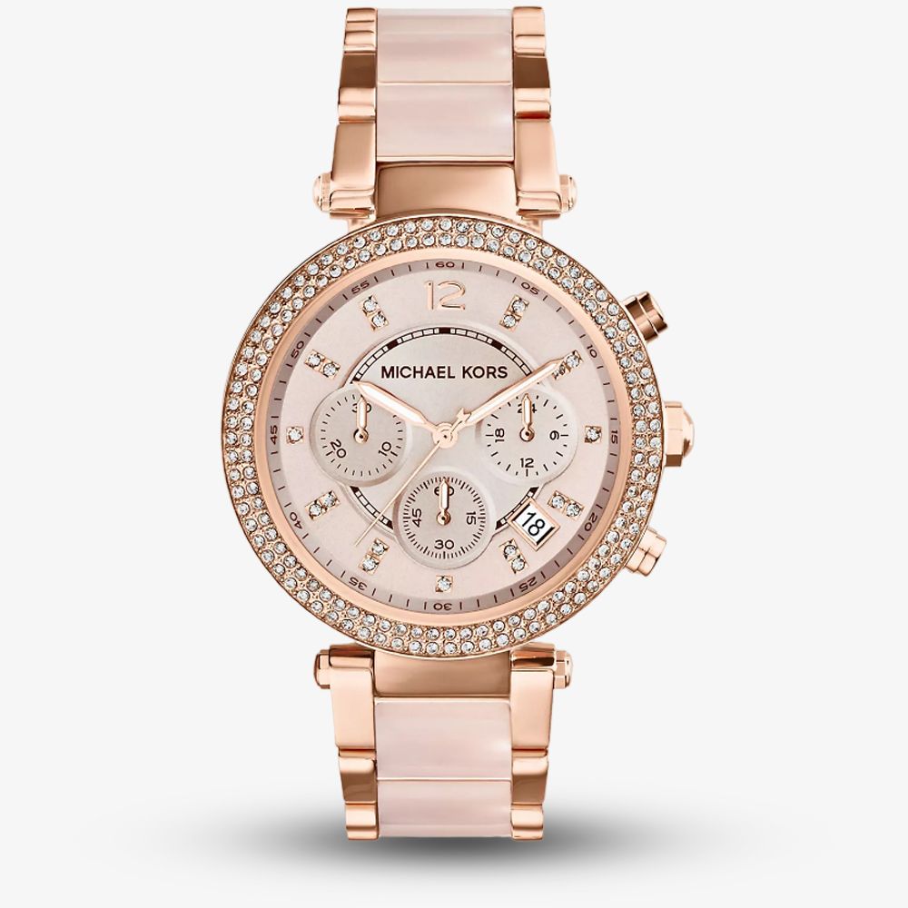 From Michael Kors is this stunning rose gold plated bracelet watch with elegant blush pink accents to complement the rose gold and sparkling stone set chronograph dial and bezel.
