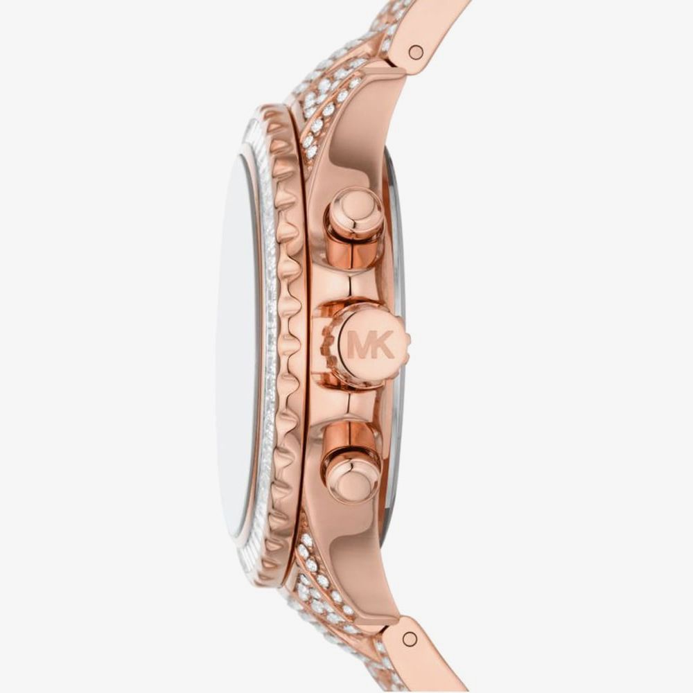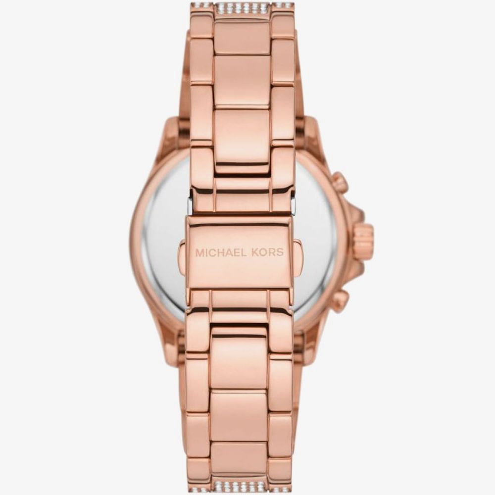 The Michael Kors Ladies Everest MK7235 watch combines a 36mm round shaped rose gold-tone stainless-steel case with a sparkling crystal set bezel and matching stainless-steel bracelet with a push button deployment clasp. It has a rose gold-tone & crystal set analogue chronograph dial which is protected beneath a mineral crystal glass. Power is generated by the quartz movement. This model also has a water resistance of up to 50 metres. Case Depth Approximately 11.70mm