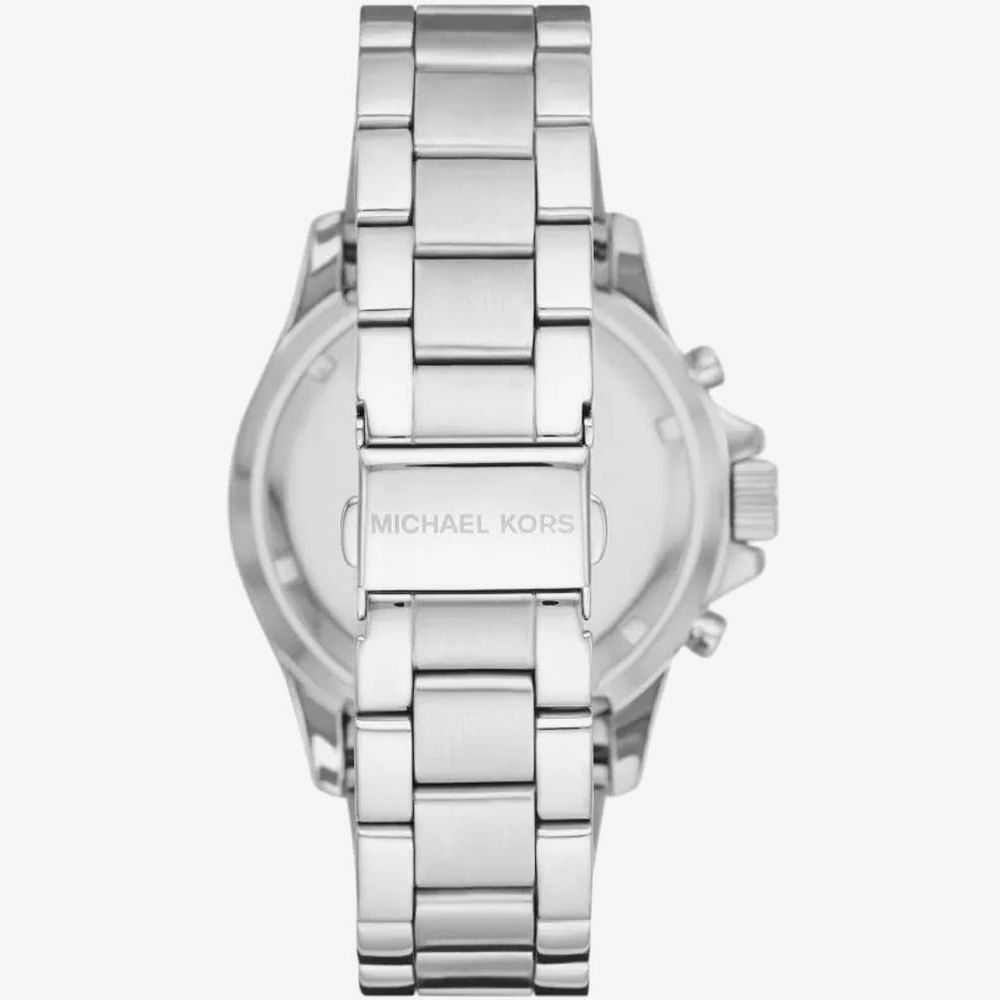 The Michael Kors Ladies Everest MK7237 watch combines a 42mm round shaped stainless-steel case with a baguette cut white & blue crystal bezel and a stainless-steel bracelet with a push button deployment clasp. It has a blue analogue chronograph dial with a date display which are protected beneath a mineral crystal glass. Power is generated by the quartz movement. This model also has a water resistance of up to 100 metres. Case Depth Approximately 12.30mm