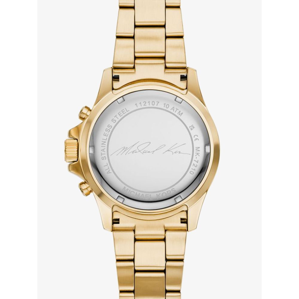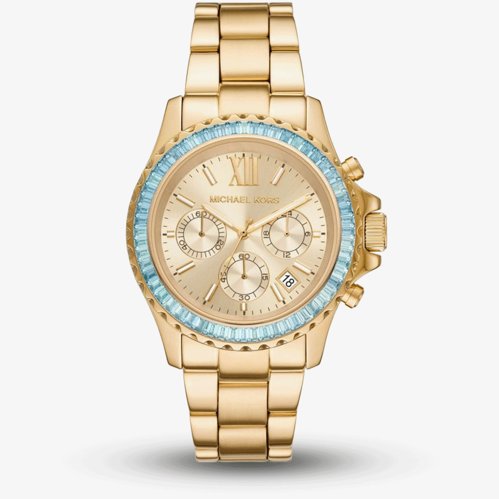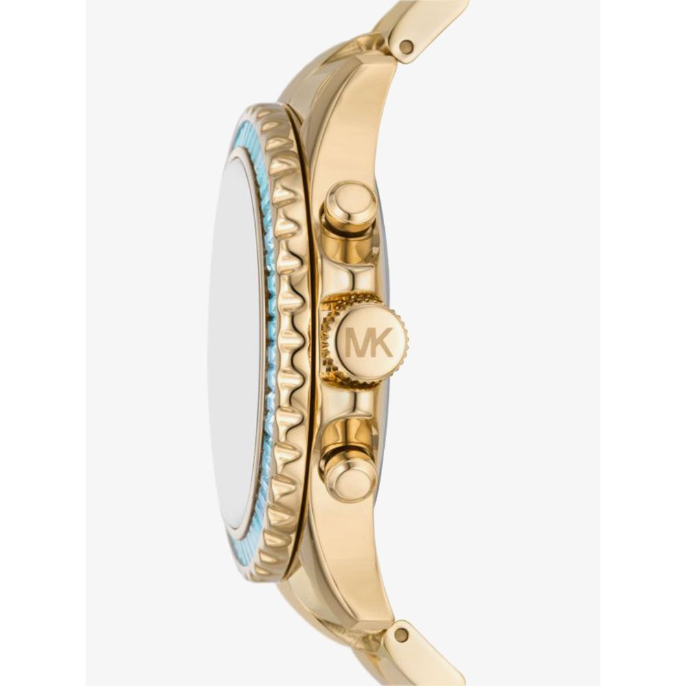 Michael Kors Ladies Everest Chronograph Green Stone MK7210 watch combines a 42mm round shaped stainless steel case and gold metal alloy bracelet with a 0. It has a gold analogue dial which is protected beneath mineral crystal glass. Power is generated by the quartz movement. This model also has a water resistance of up to 100 metres.