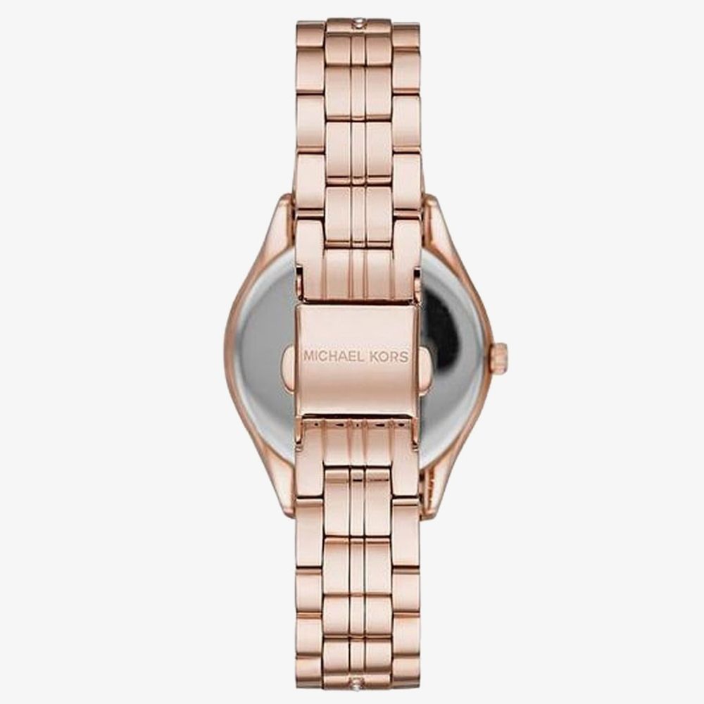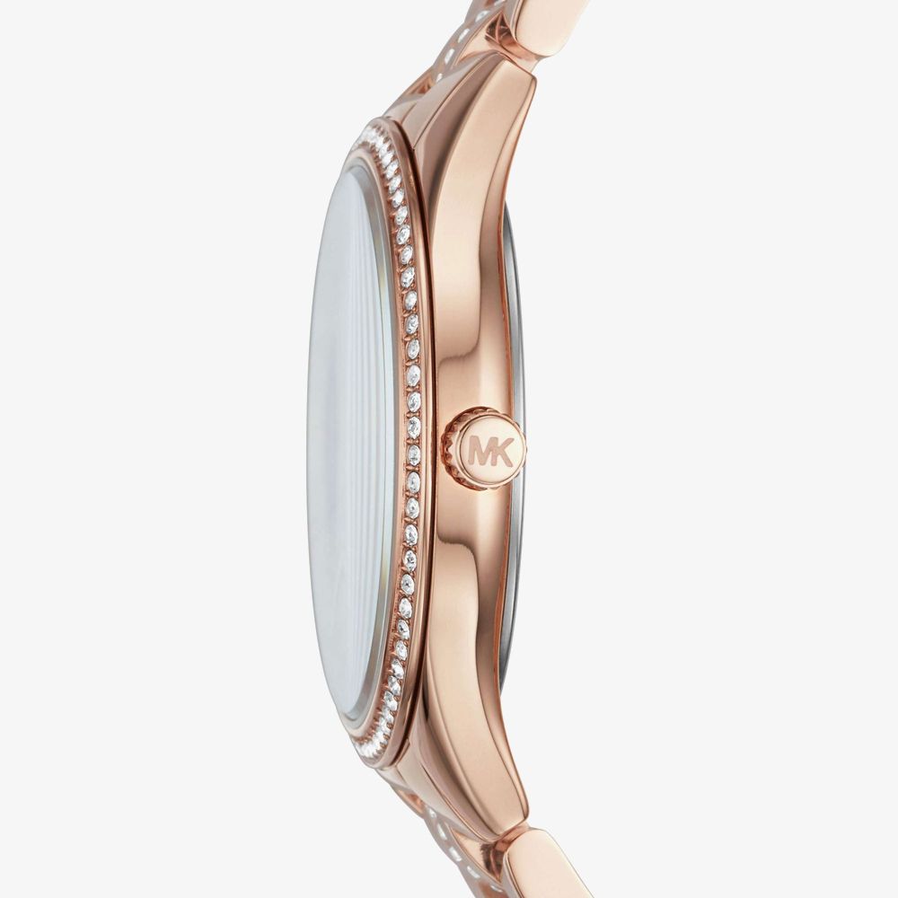 New for AW17, the Lauryn is a dress watch that comes in a classic or boyfriend size, and maintains Michael Kors' signature sophisticated and elegant look. This model boasts a rose-gold tone across the case and bracelet, with a white mother of pearl dial that highlights the alternating roman numerals. A circle of pavé stones encases the hand mechanism, matching the stone-set bezel and pavé detailing down the centre of each link.