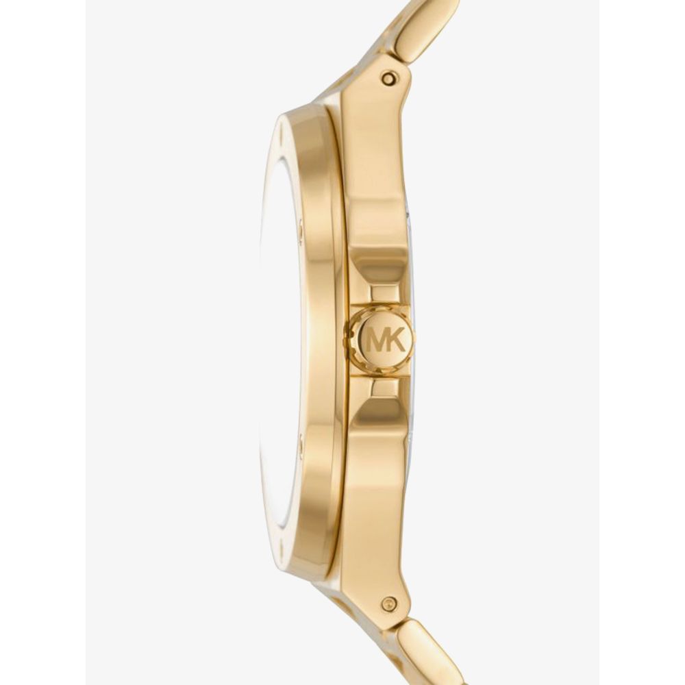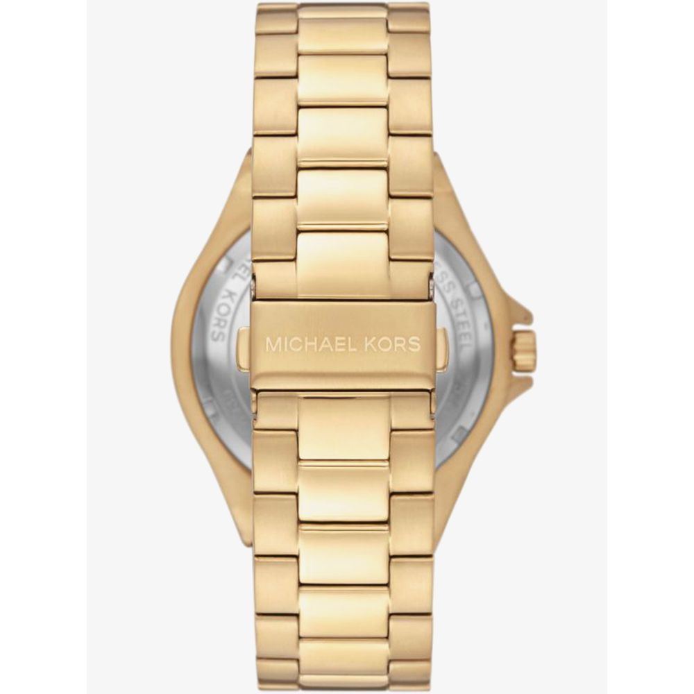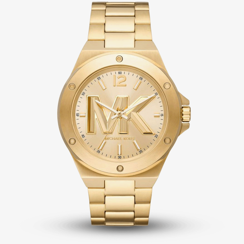 Michael Kors Ladies Lennox Gold Logo MK8939 watch combines a 45mm round shaped stainless steel case and gold metal alloy bracelet with a 0. It has a gold analogue dial which is protected beneath mineral crystal glass. Power is generated by the quartz movement. This model also has a water resistance of up to 50 metres.