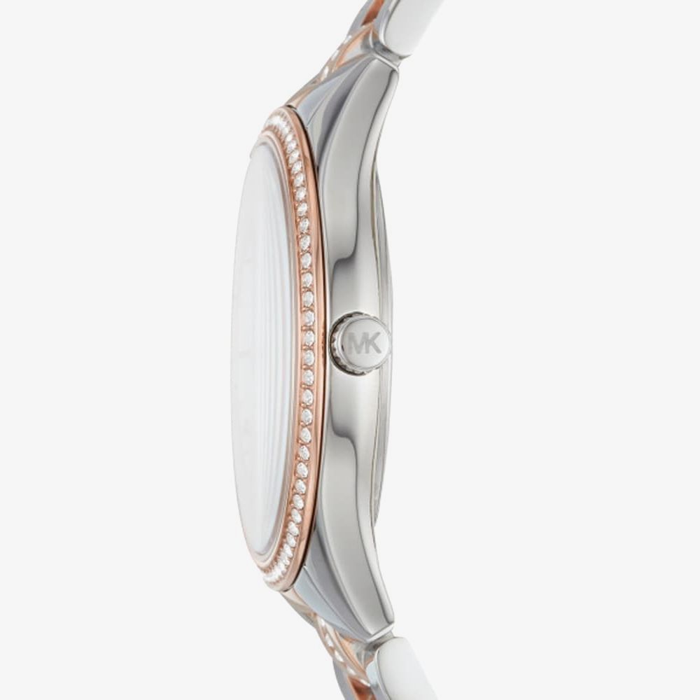 The new AW18 Mini Lauren, the MK3979, offers a two-tone rose blush variation to the existing block-colour lines. It maintains it's iconic pavé topring, inner bezel and centre-lined links whilst introducing a rose-tinted mother of pearl dial, rose-tone Roman Numeral hour markers and hands, as well as a high-polished silver-tone finish to the outer links and casing.