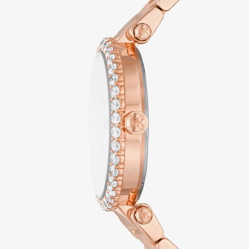 The Michael Kors MK4695 watch combines a 38mm round shaped stainless steel case and rose gold stainless steel bracelet with a fold over clasp. It has a white analogue dial with date display which is protected beneath mineral crystal glass. Power is generated by the quartz movement. This model also has a water resistance of up to 50 metres.