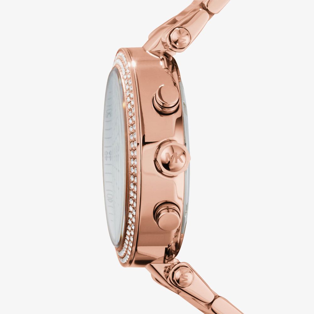 From Michael Kors is this stunning rose gold plated bracelet watch complete with a beautiful mother of pearl chronograph dial and sparkling stone set accents. Product Description: - Rose Gold Plated Bracelet Watch - Mother of Pearl Chronograph Dial - Quartz Movement - Dimension: 39mm 12mm Depth - Water Resistance: 100 metres