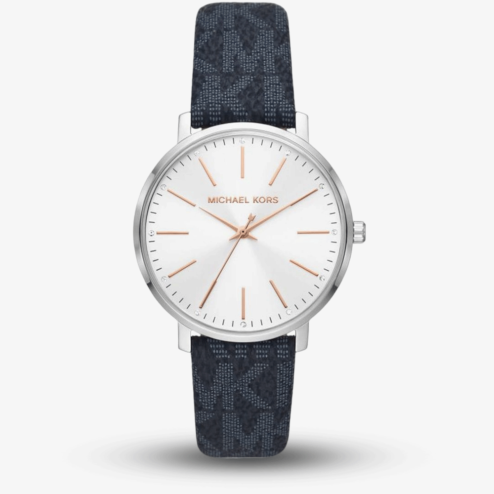 The Michael Kors Ladies Pyper MK7244 watch combines a 38mm round shaped stainless-steel case and an MK logo blue plastic strap with a traditional buckle. It has a white analogue dial with contrasting rose gold-tone hands & hour markers which are protected beneath a mineral crystal glass. Power is generated by the quartz movement. This model also has a water resistance of up to 50 metres.