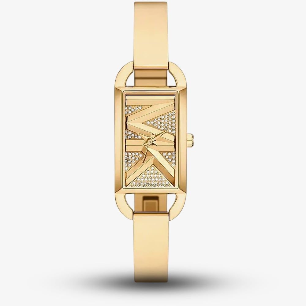 The Michael Kors MK Empire is a striking gold-tone stainless steel watch featuring the iconic MK logo prominently displayed on the face. The pavé dial adds a glamorous sparkle, making it a standout accessory for those who appreciate bold, luxurious design.