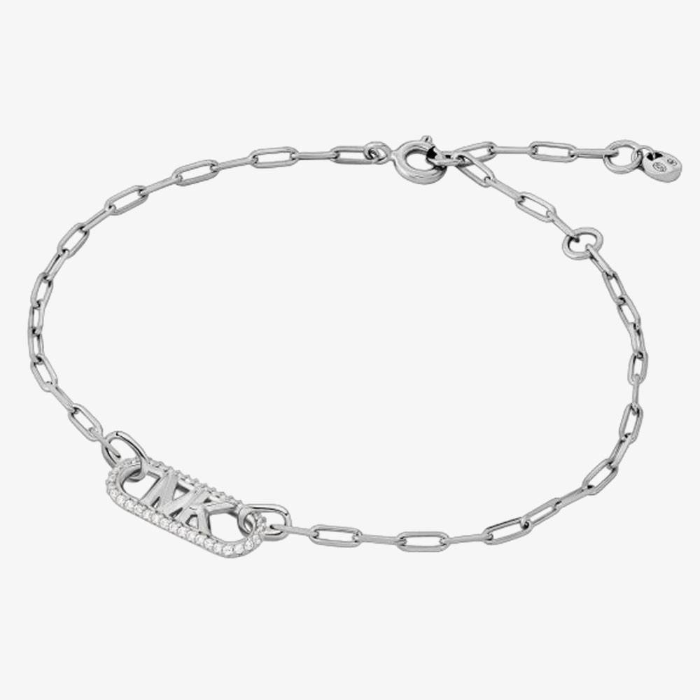 Crafted with exquisite attention to detail, this bracelet showcases the iconic Michael Kors aesthetic. The sterling silver chain is elegantly adorned with a shimmering MK logo design surrounded with white cubic zirconia stones, adding a touch of glamour to any outfit.